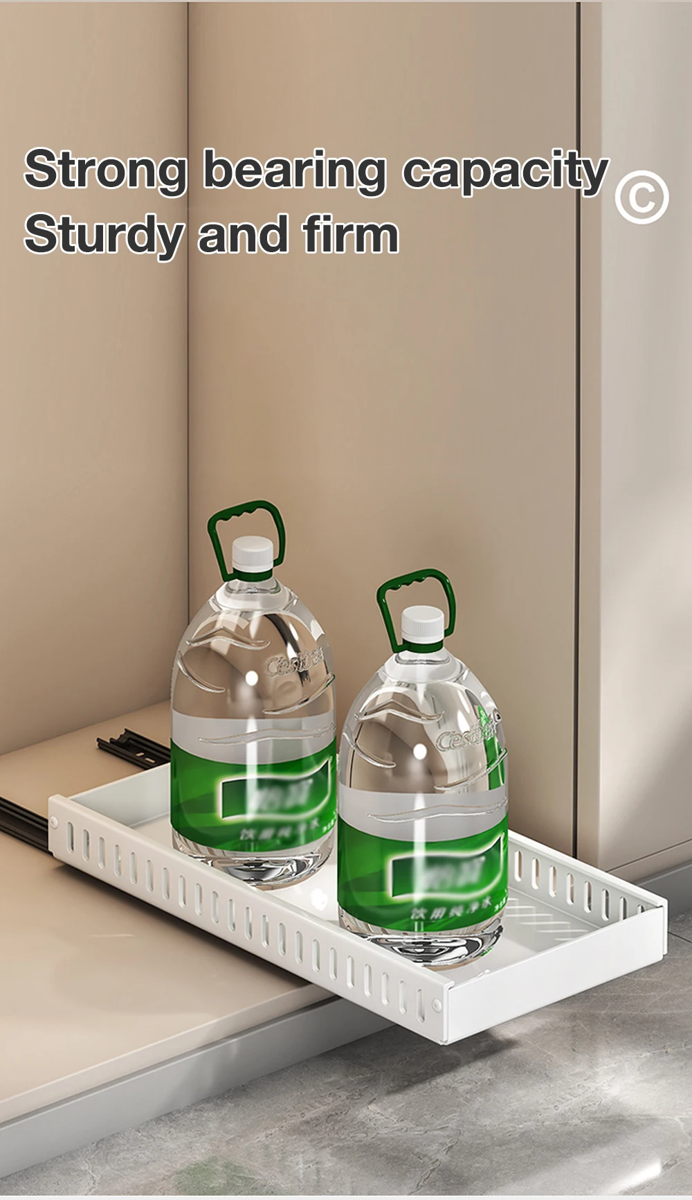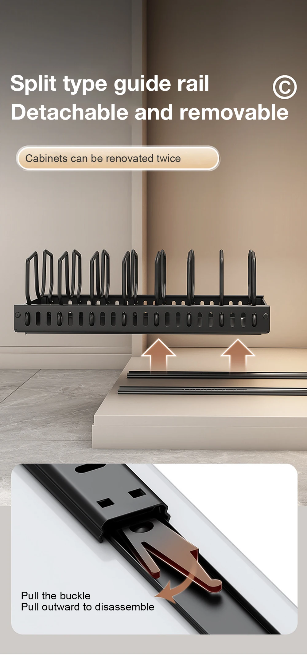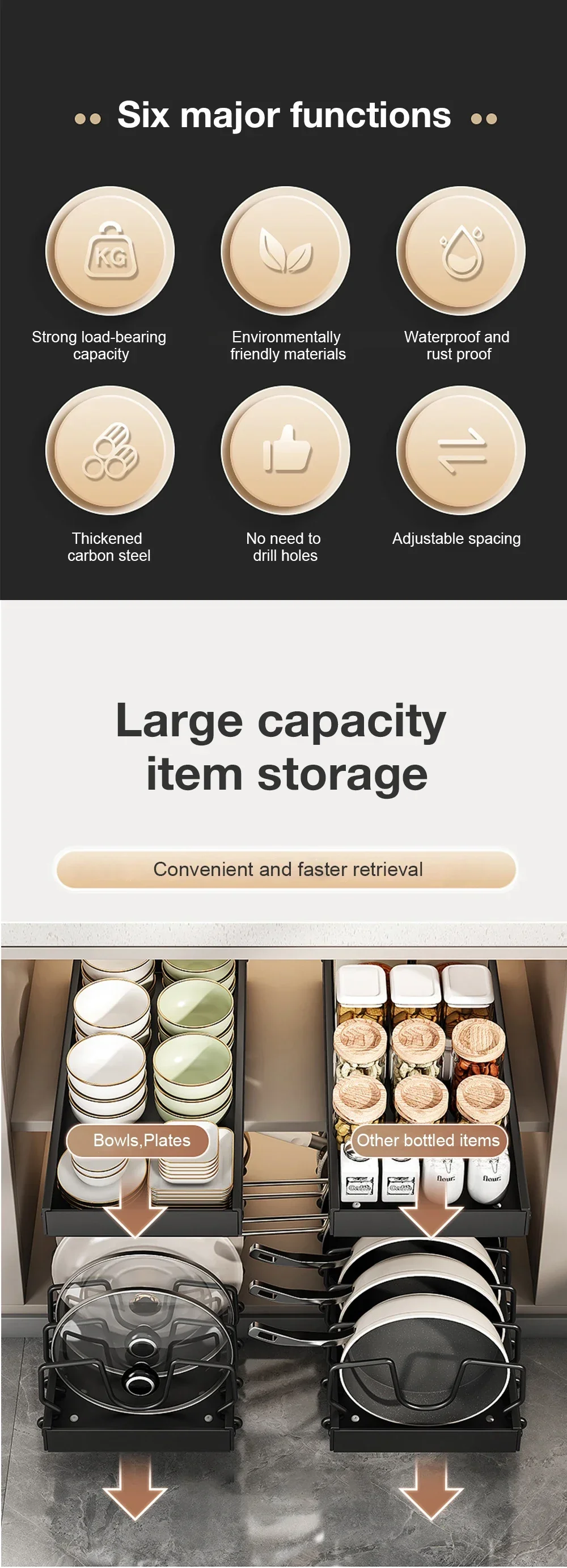 4.Este suporte para panelas é projetado com trilhos deslizantes e bolas de polia embutidas, com apenas um puxão suave, você pode armazenar ou retirar seus utensílios de cozinha, não precisa mais agachar, procurar e organizar seus utensílios de cozinha.
