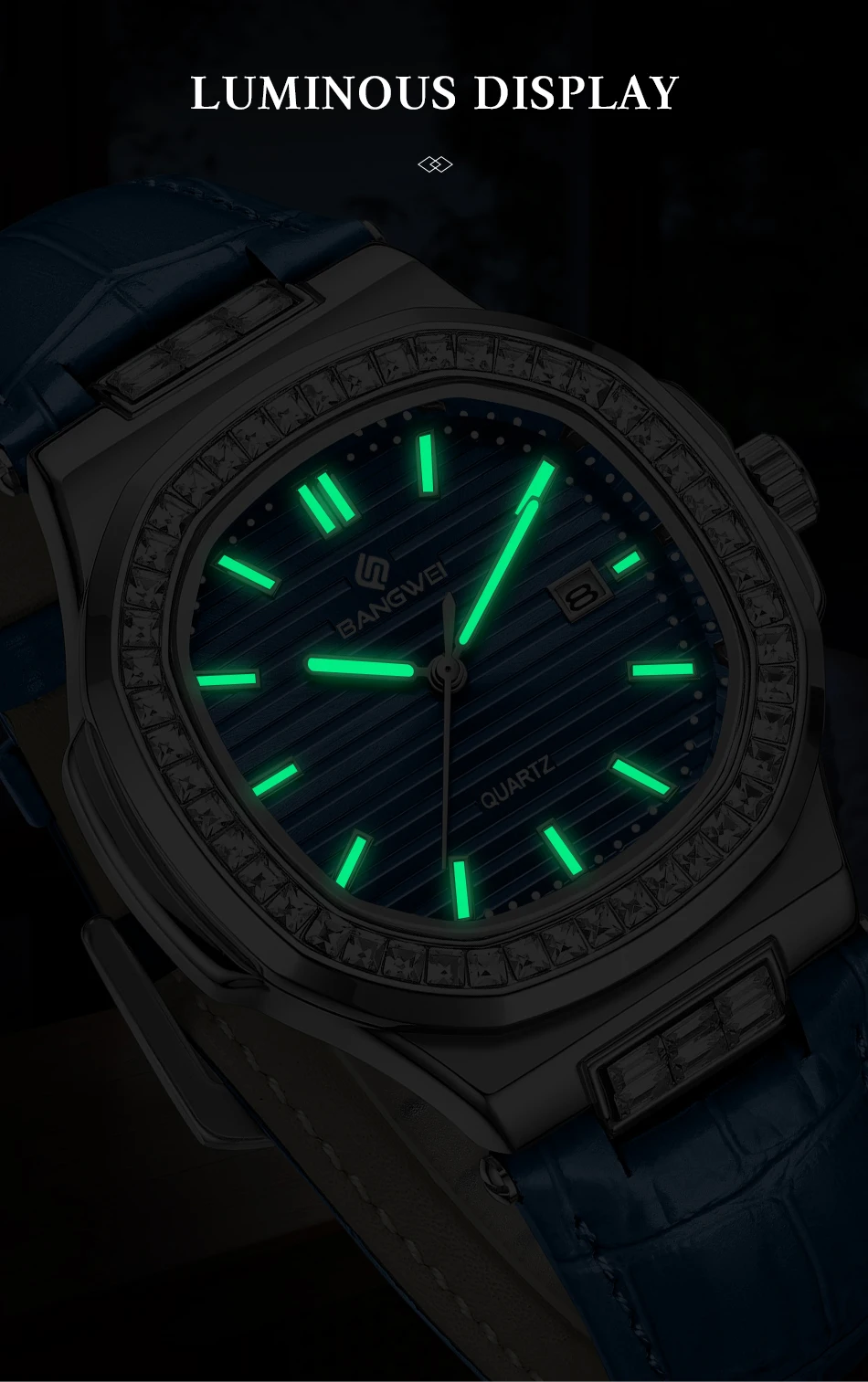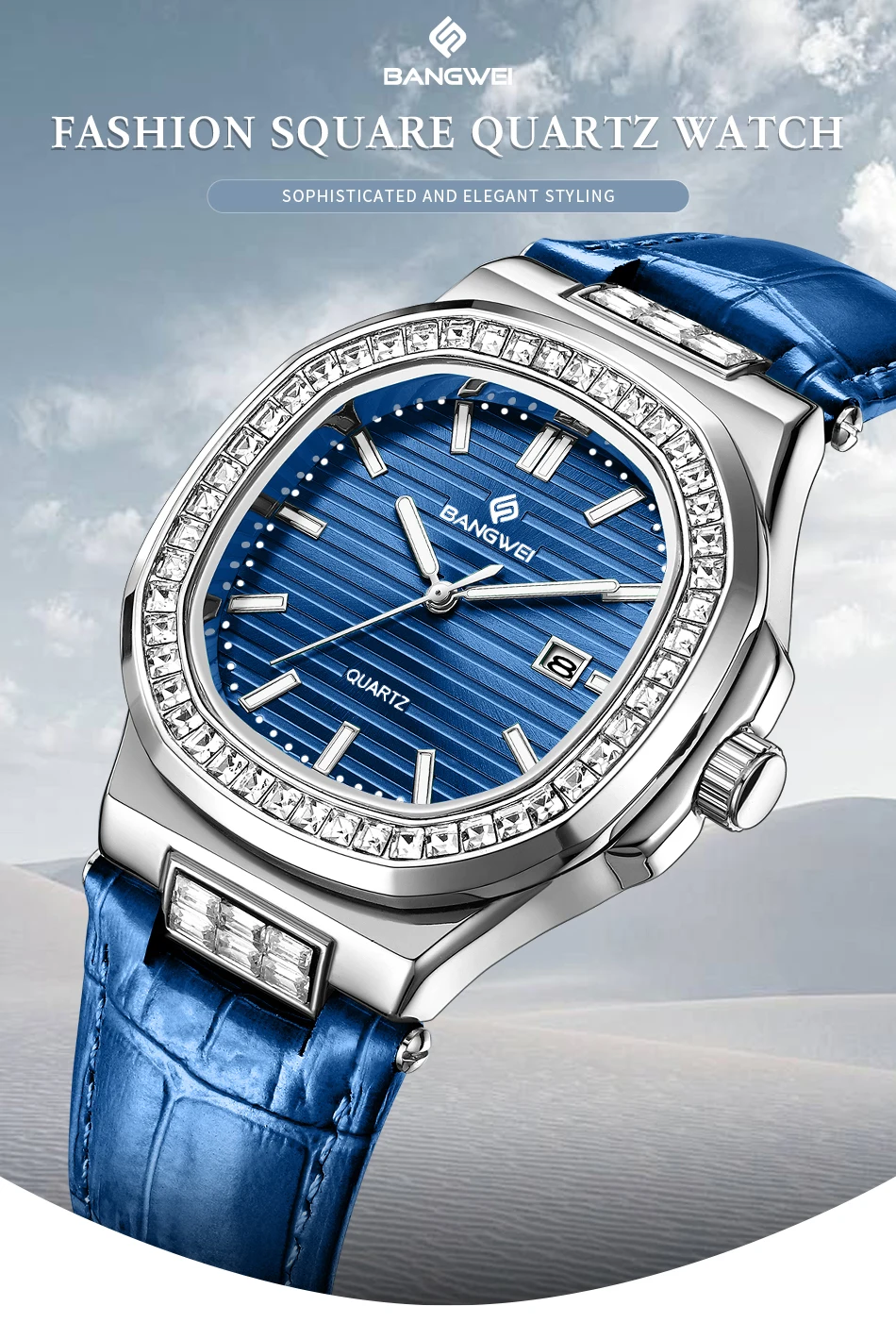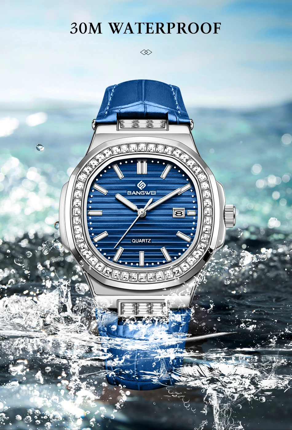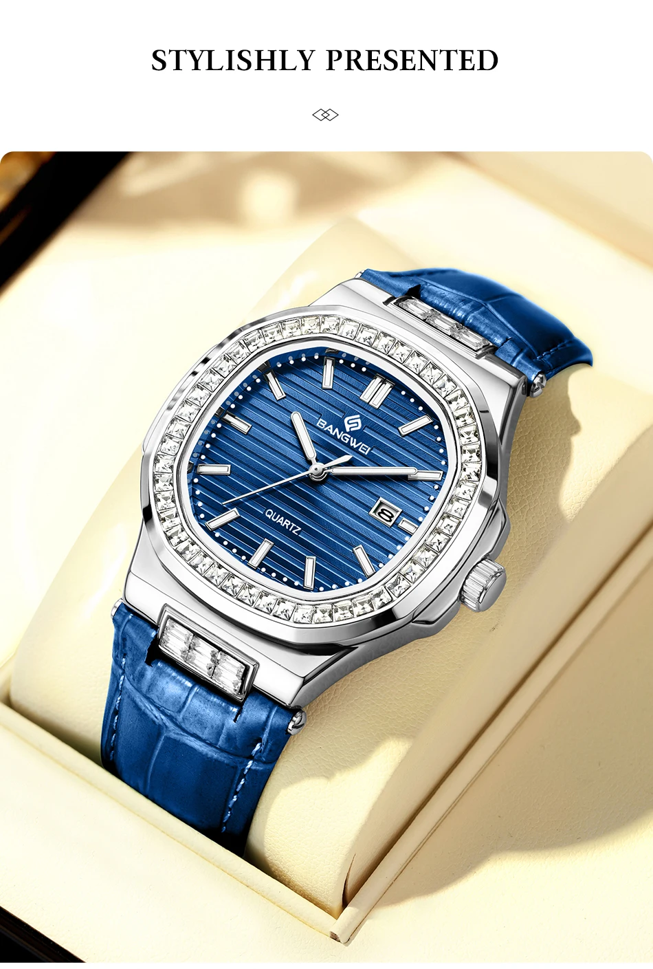 - > Nova moda bangwei elegante luxo quartzo mulher relógio simples dial diamante retro couro data à prova dwaterproof água luminosa relógios femininos