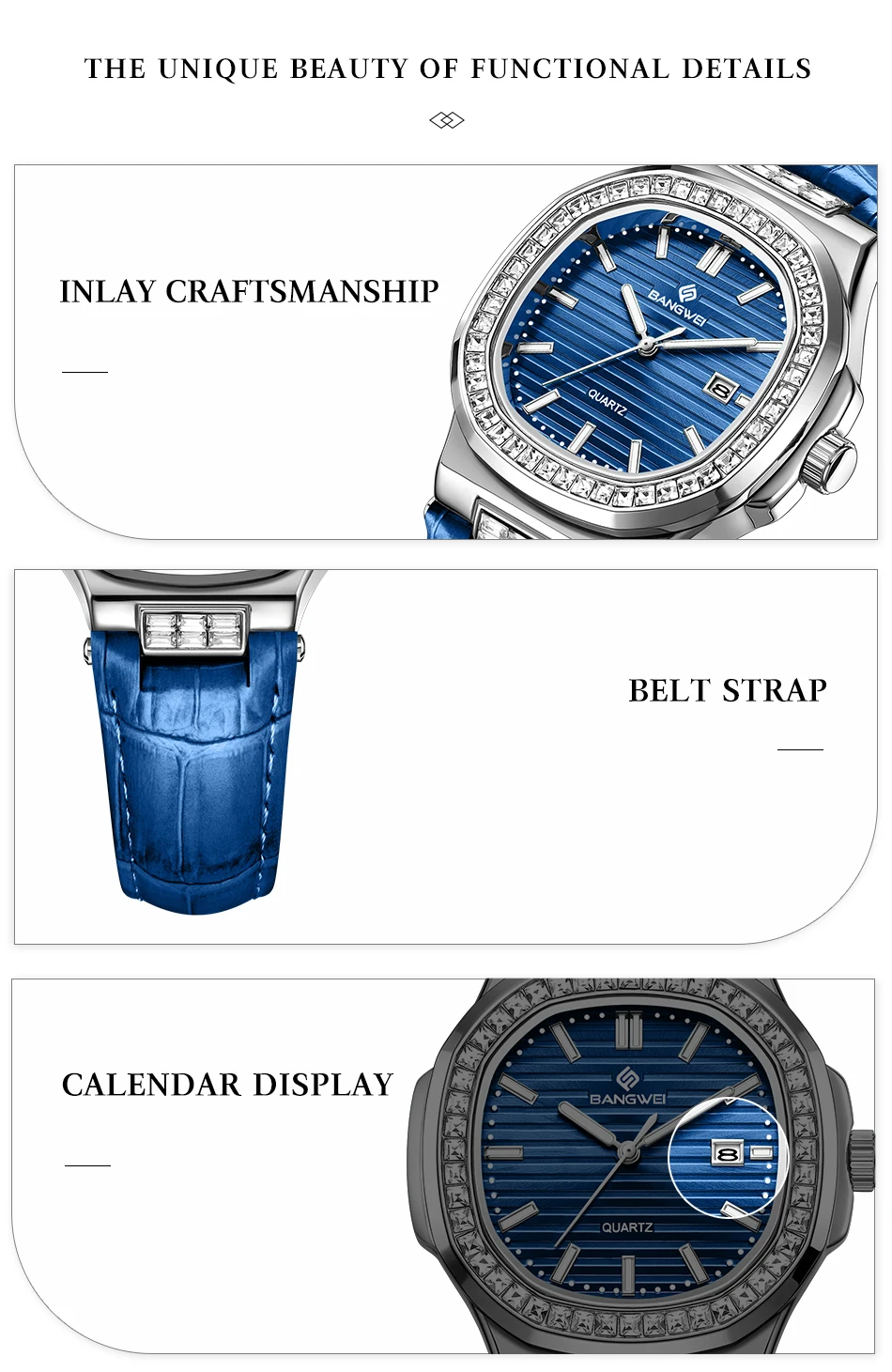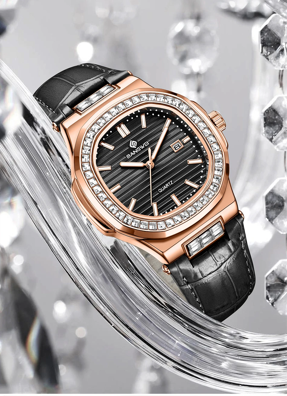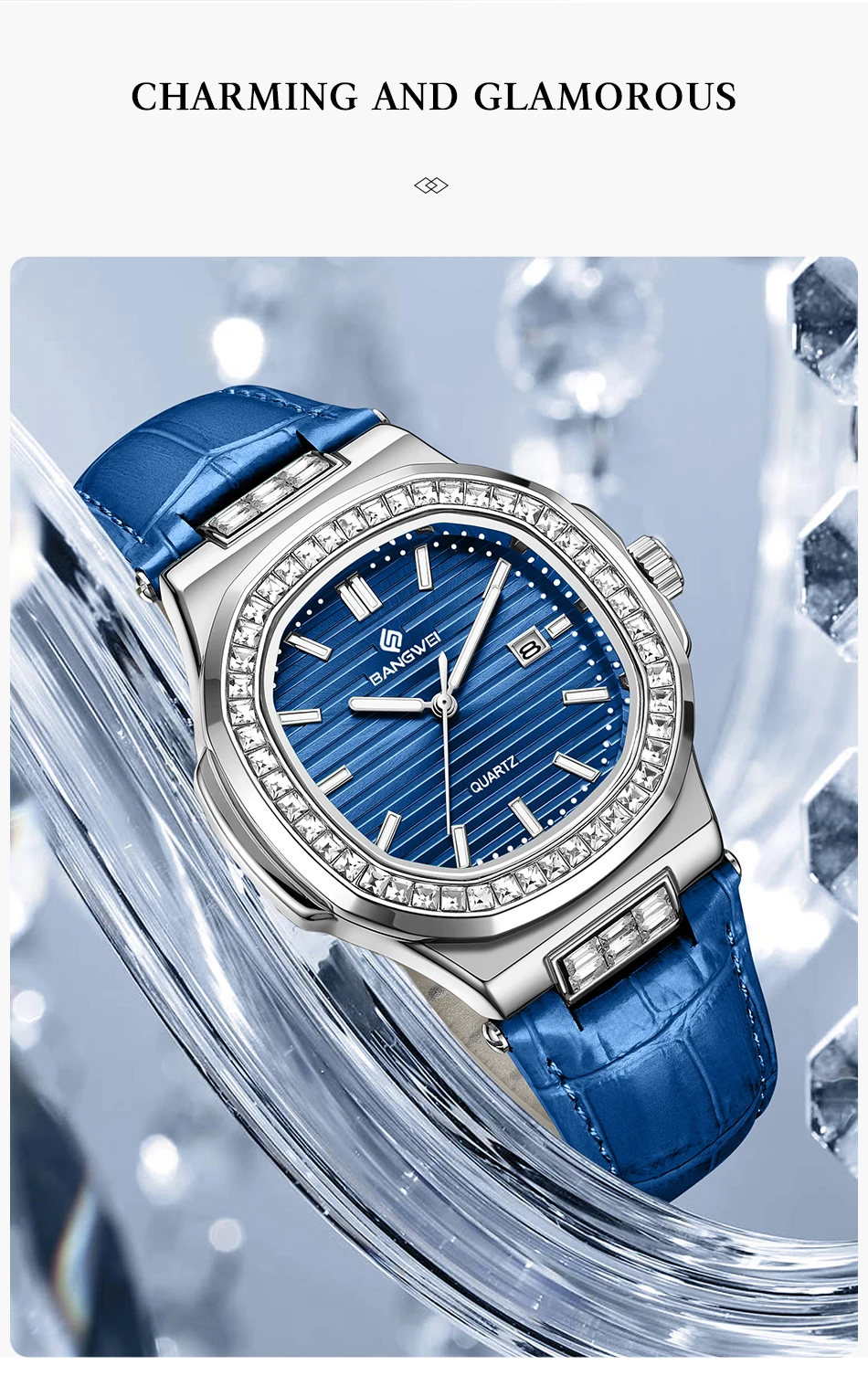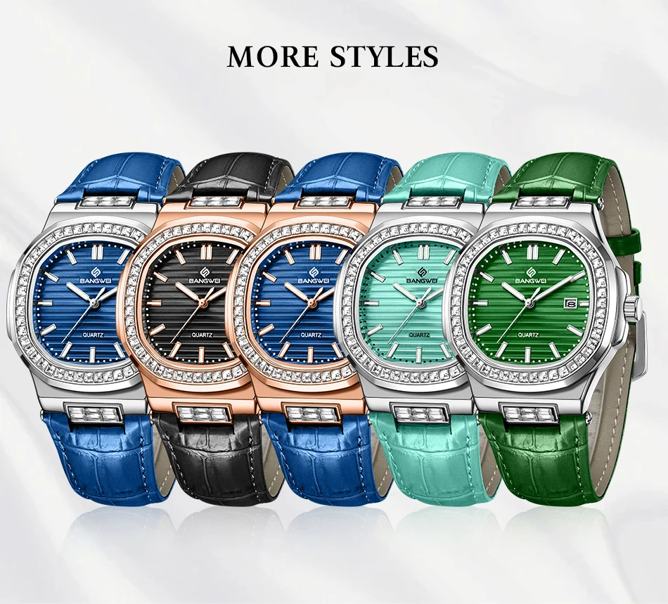 - > Nova moda bangwei elegante luxo quartzo mulher relógio simples dial diamante retro couro data à prova dwaterproof água luminosa relógios femininos