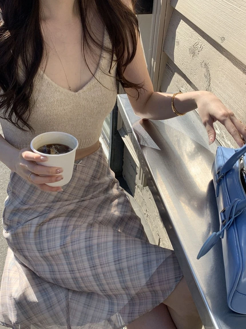 Nova Saia Midi Xadrez Chique de Cintura Alta com Cauda de Peixe, Bloco de Cores, Estilo Commuter, Acima do Joelho, Primavera ...