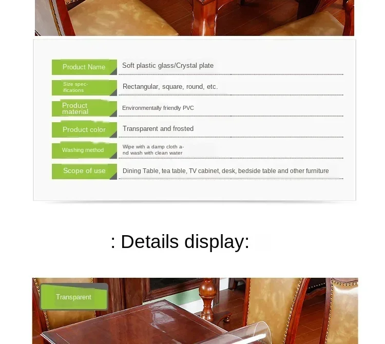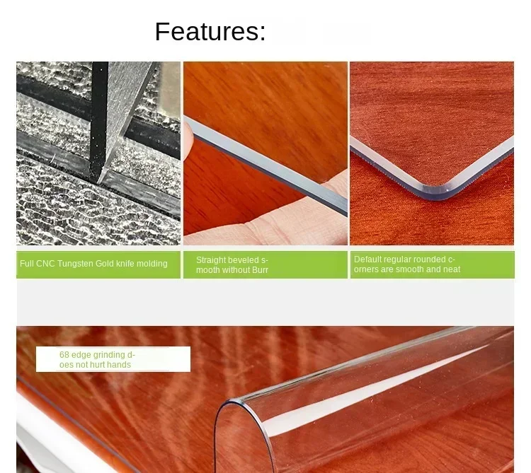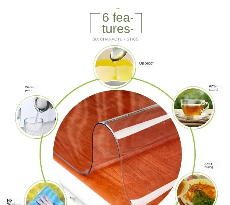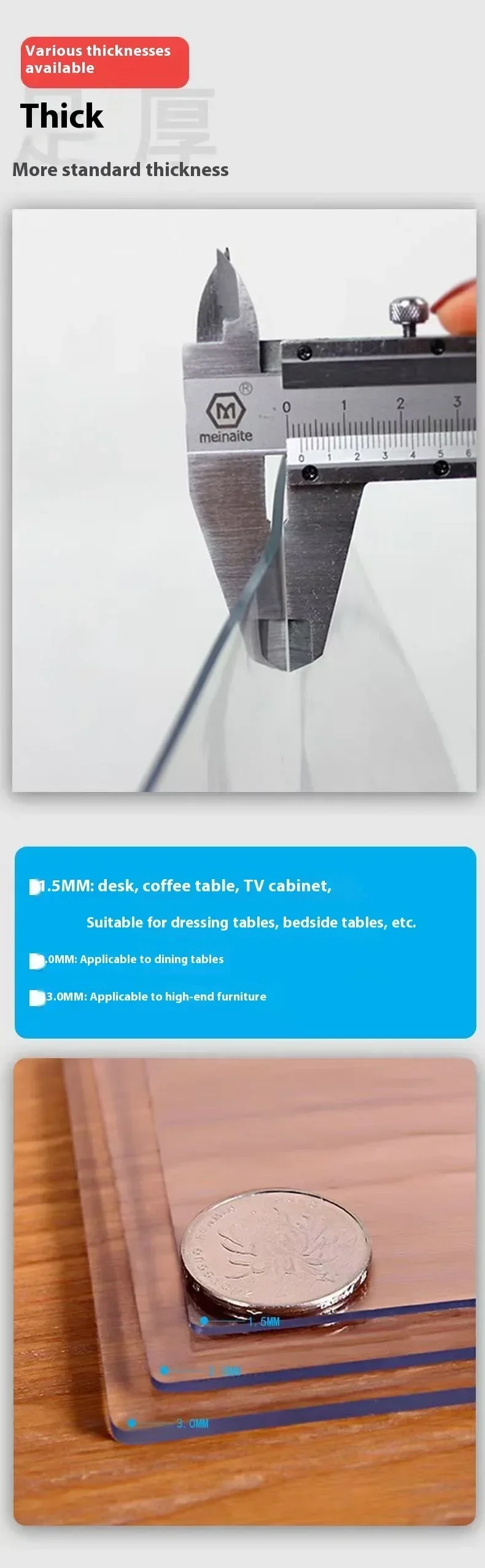 2.Protetor de mesa transparente em PVC com 1,0 mm de espessura, que possui melhor resistência ao calor, até 176°F (80°C).°abertura f/80°c. por favor, não coloque nenhum item com temperatura superior a 100℃ diretamente sobre o protetor de mesa.uma almofada extra à prova de calor seria necessária nesta situação