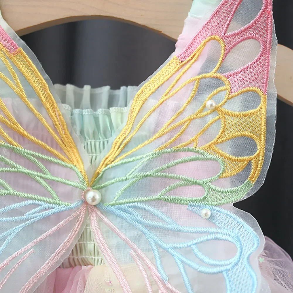 - > Novas meninas vestido de verão asas borboleta colorido sonho vestido de princesa vestido de festa de aniversário geométrico glitter vestido suspensórios