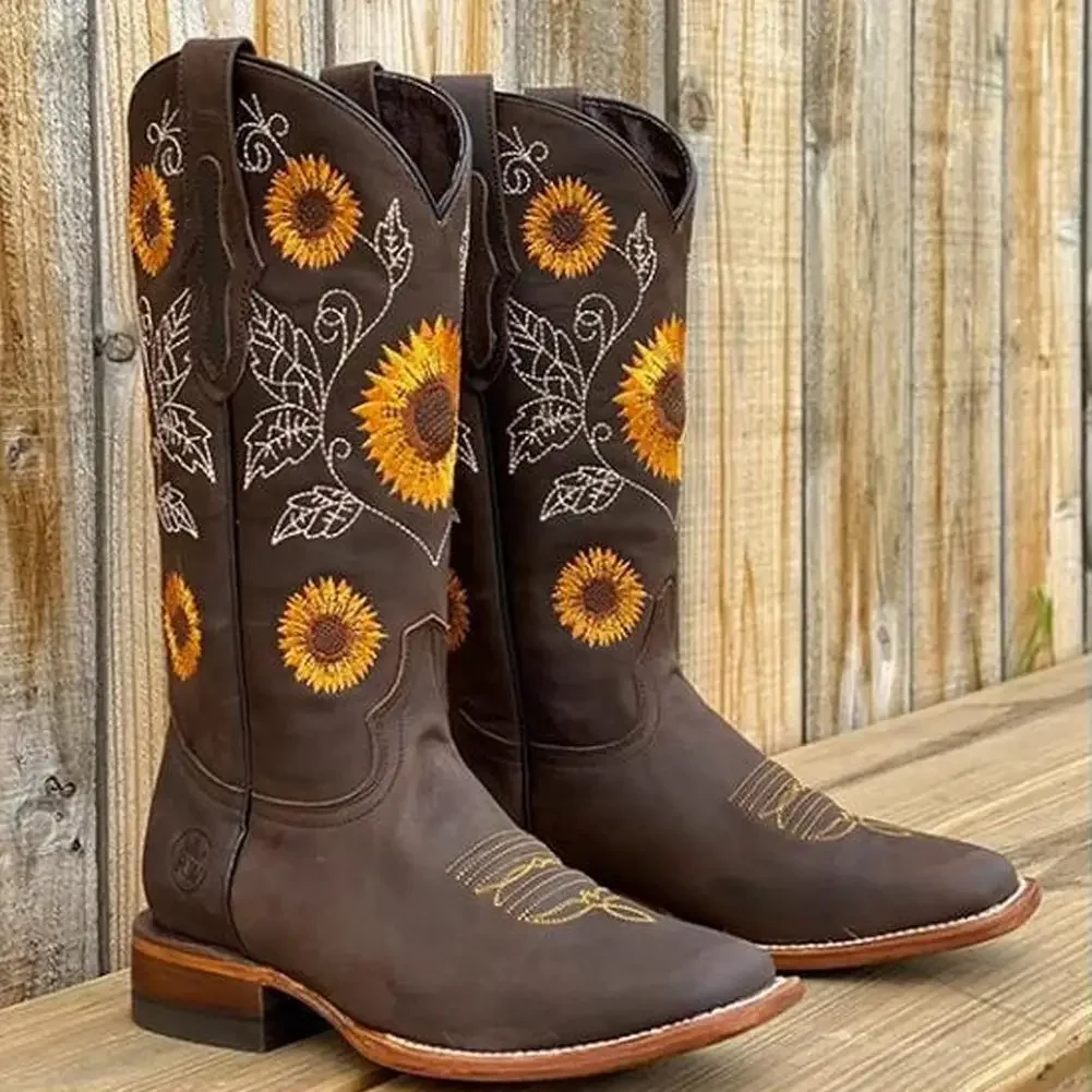 - > Novas mulheres café marrom bordado botas de couro do plutônio impresso ocidental botas de cowboy profundo v-boca alta tubo botas casuais clássico