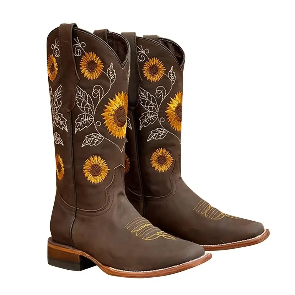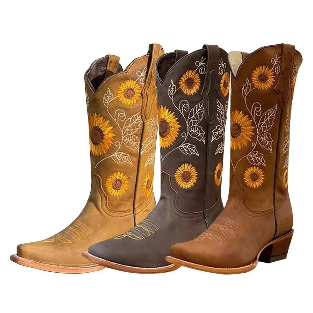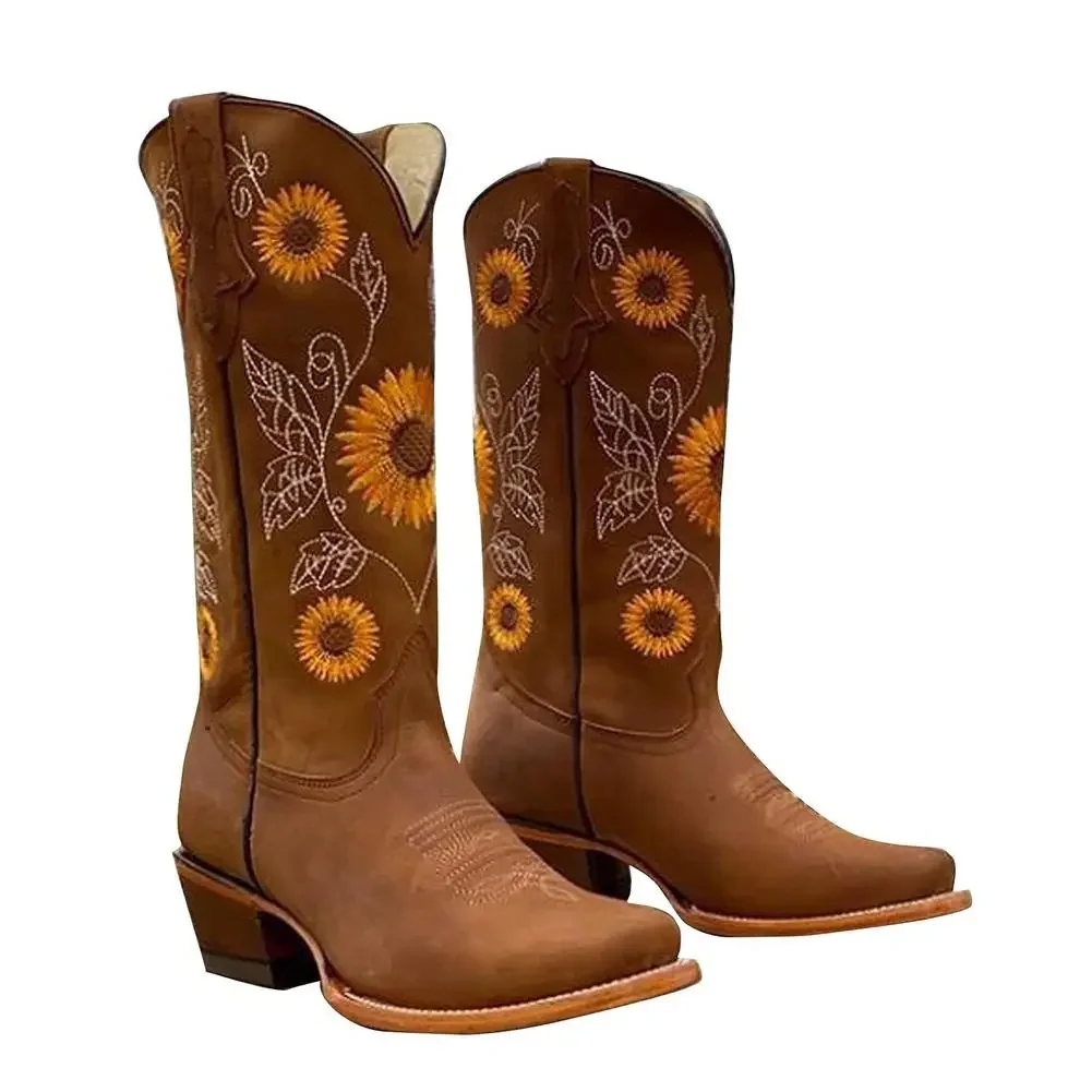 Novas mulheres café marrom bordado botas de couro do plutônio impresso ocidental botas de cowboy profundo v-boca alta tubo botas casuais clássico