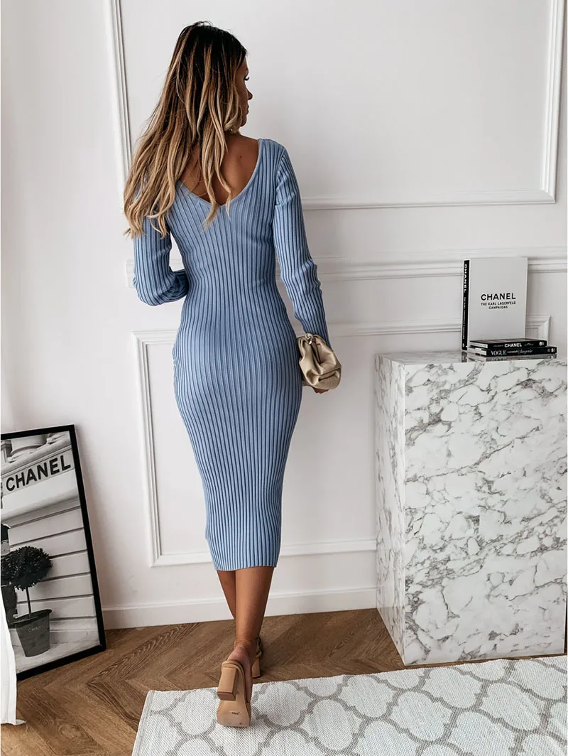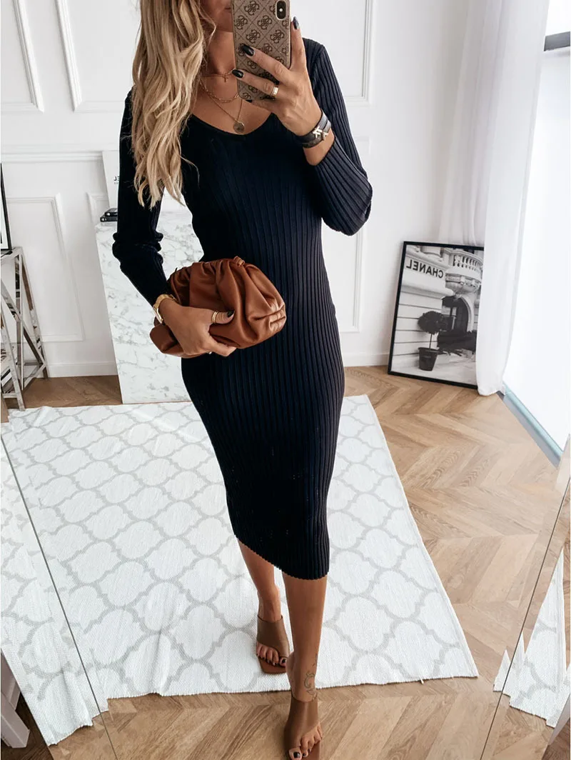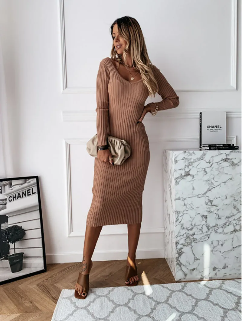 Novo 2025 primavera vestido feminino manga longa com decote em v corte baixo linha apertado festa cáqui moda básica saia longa