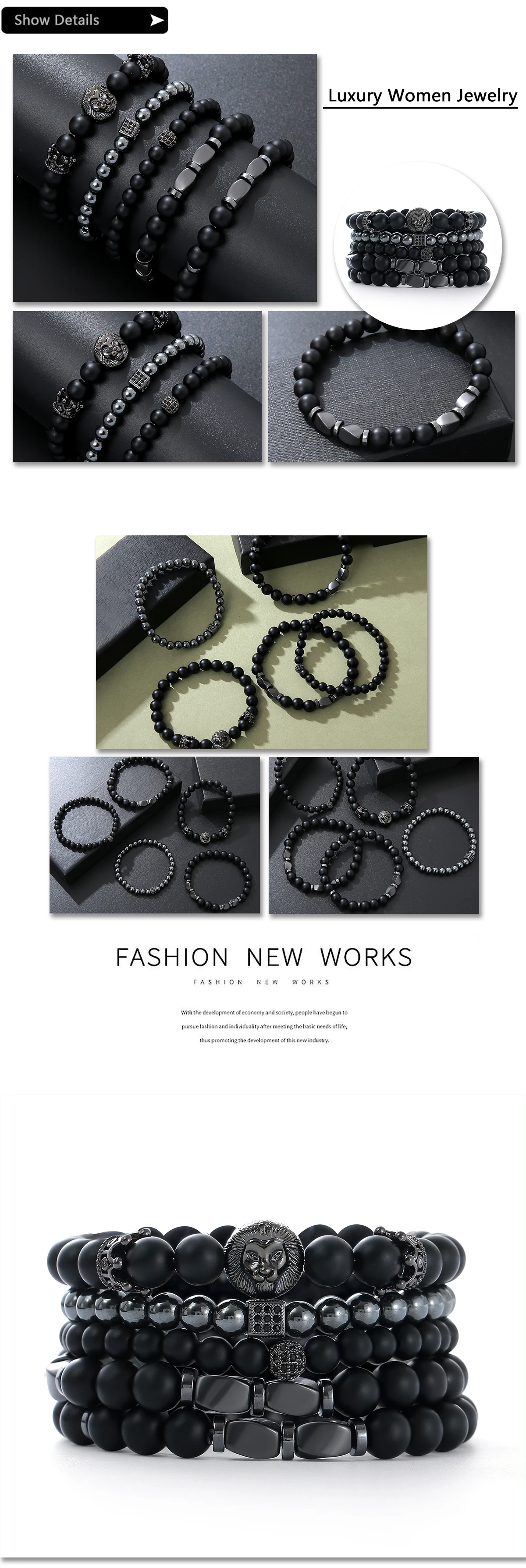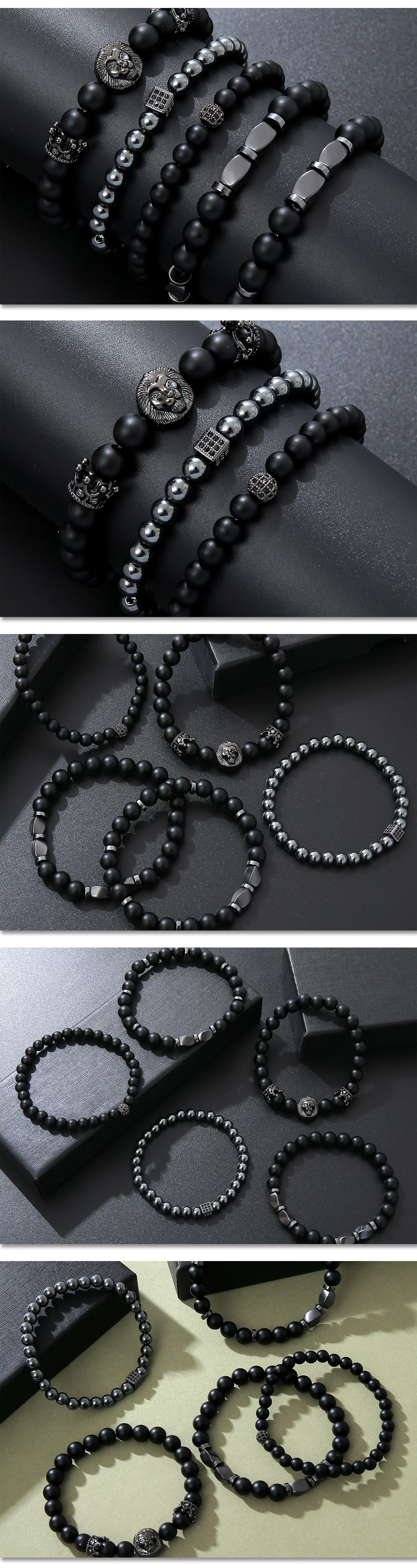 - > Novo Conjunto de Pulseiras Masculinas de Vidro Fosco Preto com Zircônia, Coroa, Diamante, Bola e Cabeça de Leão – Presentes Versáteis para Casais