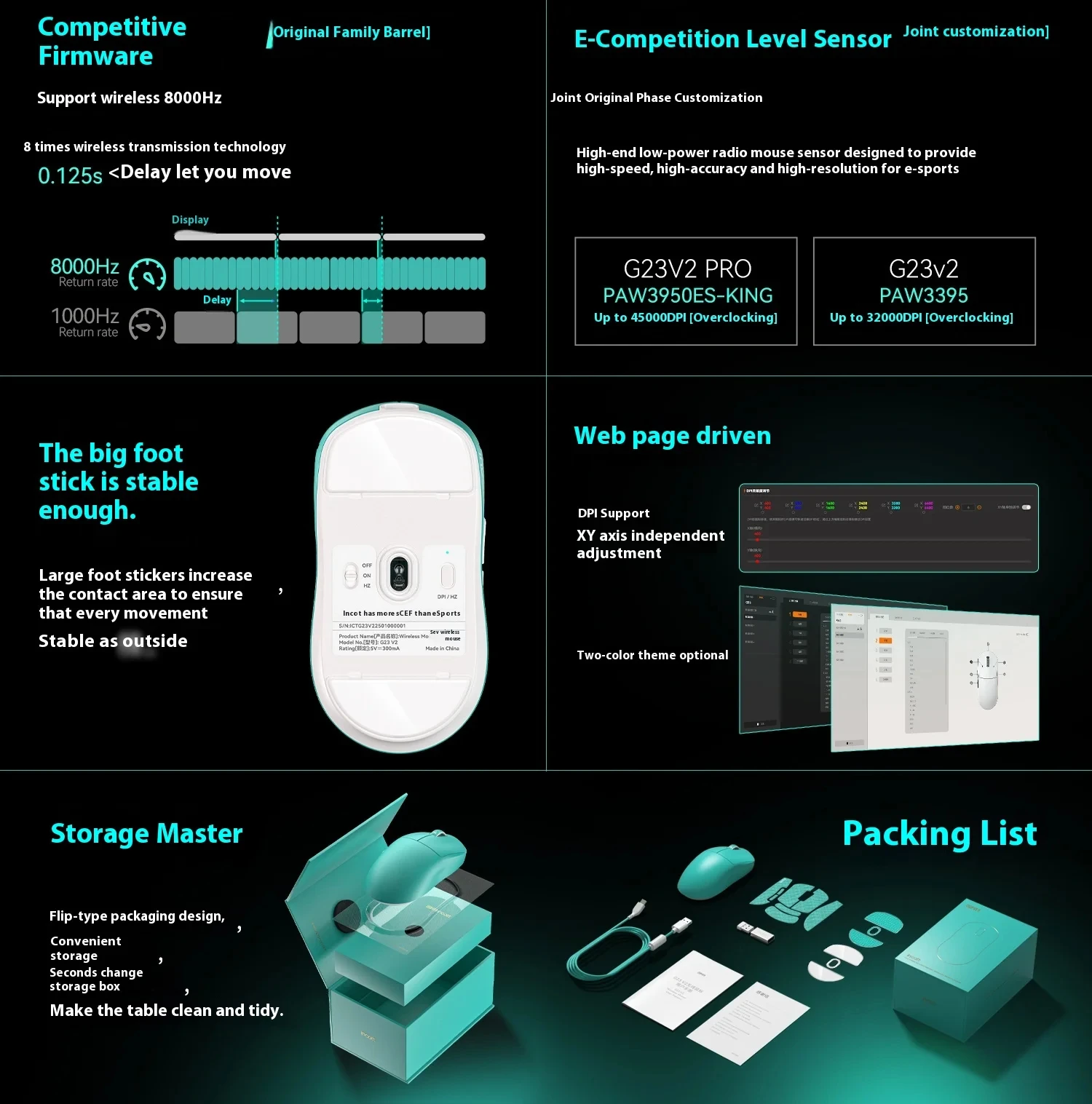 Novo mouse para jogos inct g23 v2 pro/se paw3395 47g, 3 modos, leve, sem fio, 8000hz, taxa de orolling, ultra baixa latência, mouse para jogos