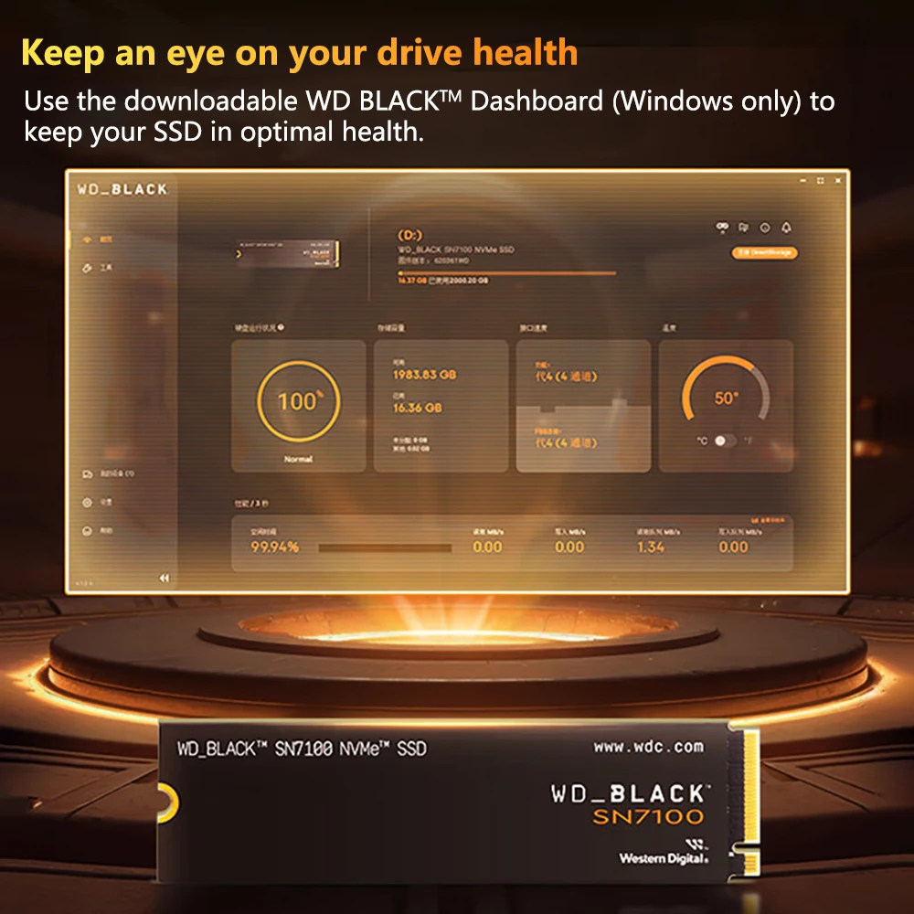 O painel WD_BLACK baixável (Windows® apenas) monitora a saúde, o desempenho e as atualizações de firmware da sua unidade e permite que o modo de jogo otimize sua experiência de jogo.