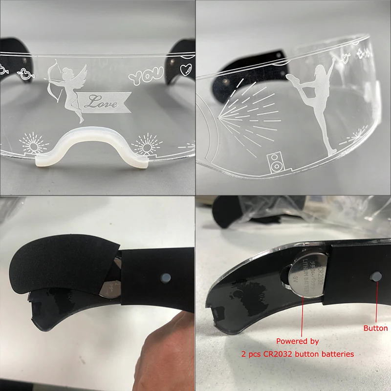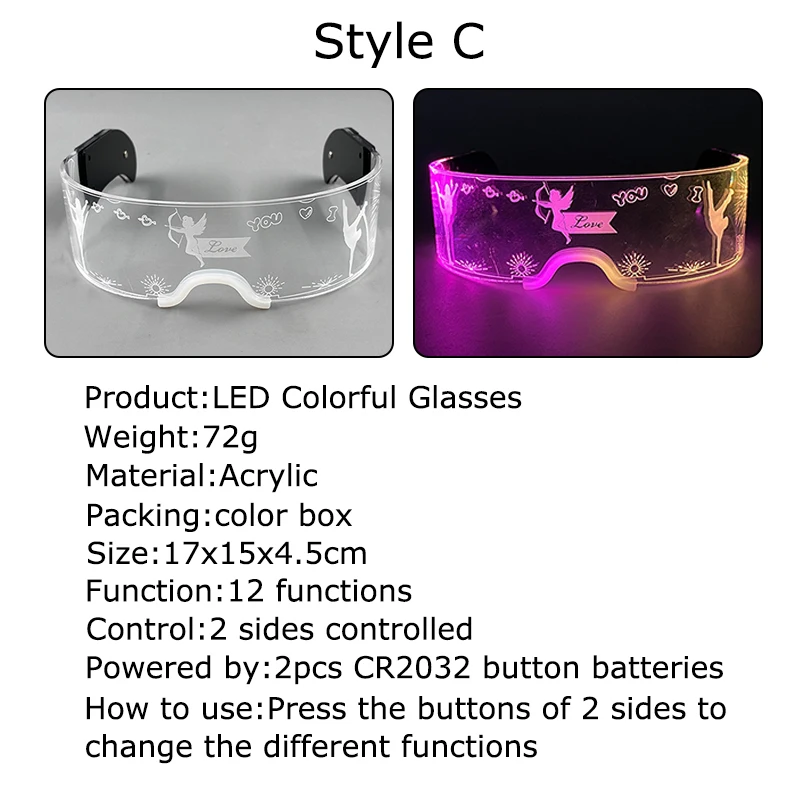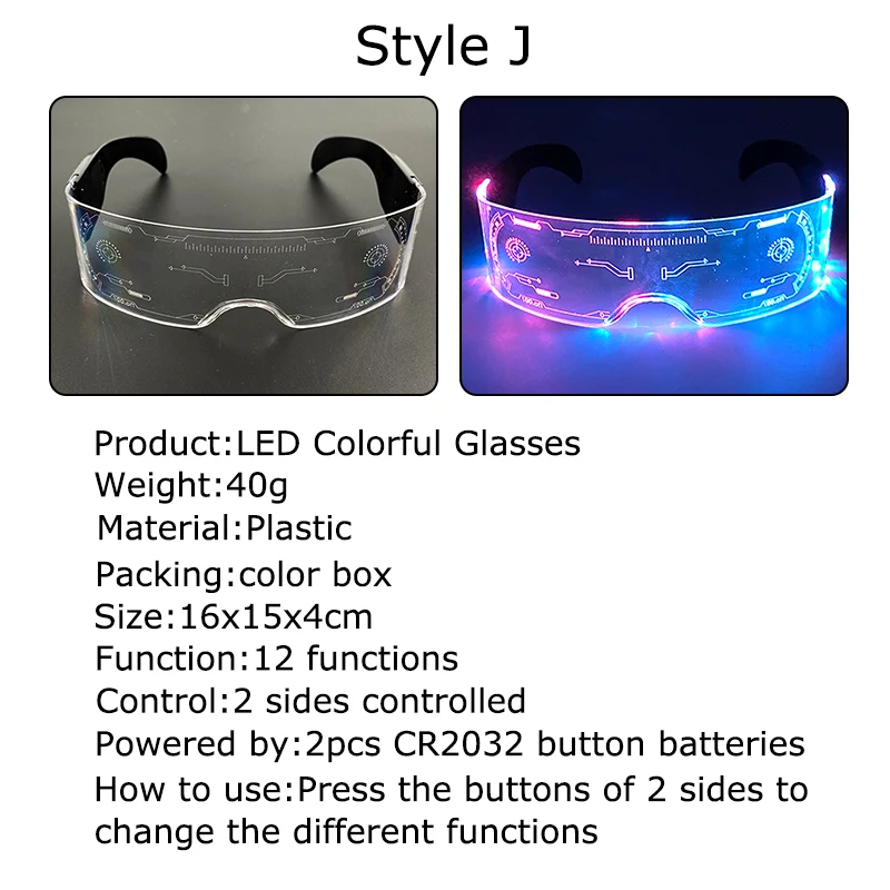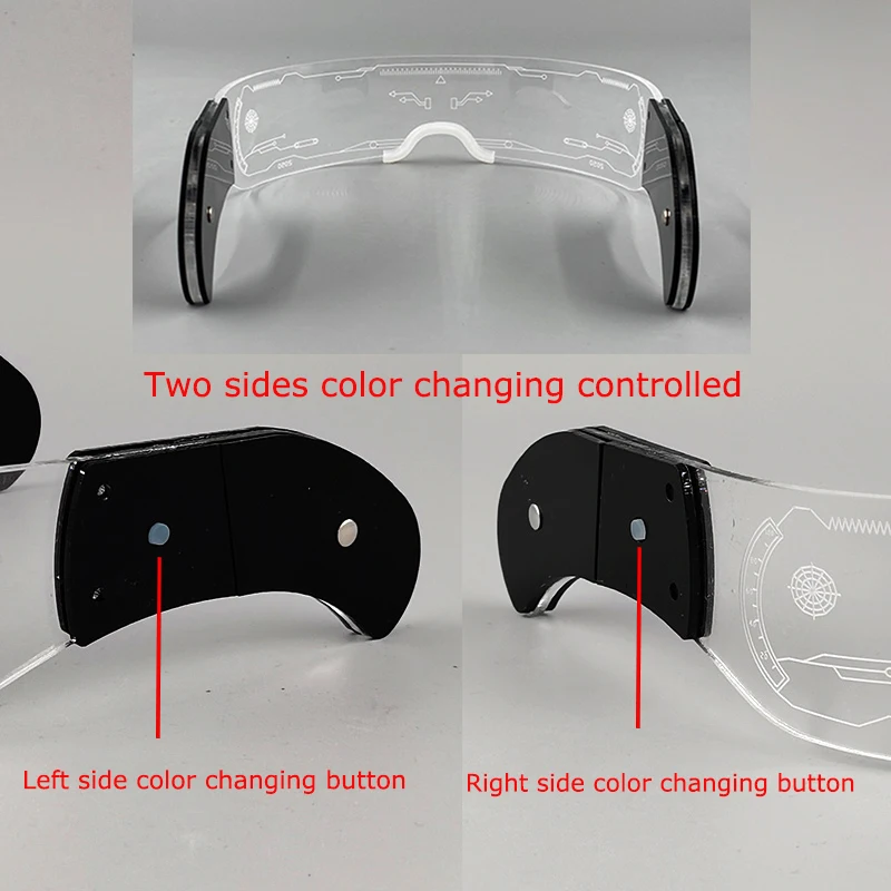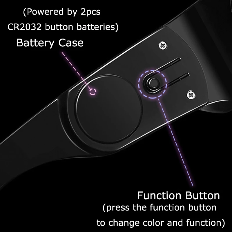 2.Selecione o modo de iluminação: Os óculos LED são controlados nos dois lados.Pressione o botão preto na lateral e, cada vez que pressioná-lo, os LEDs mudarão entre os 12 modos de iluminação abaixo:
