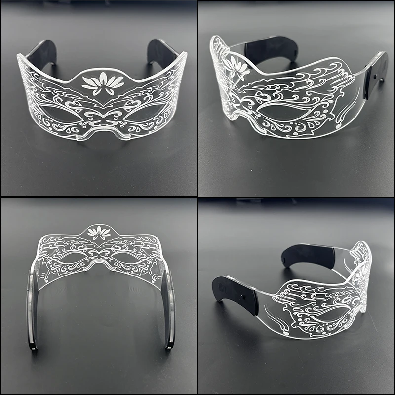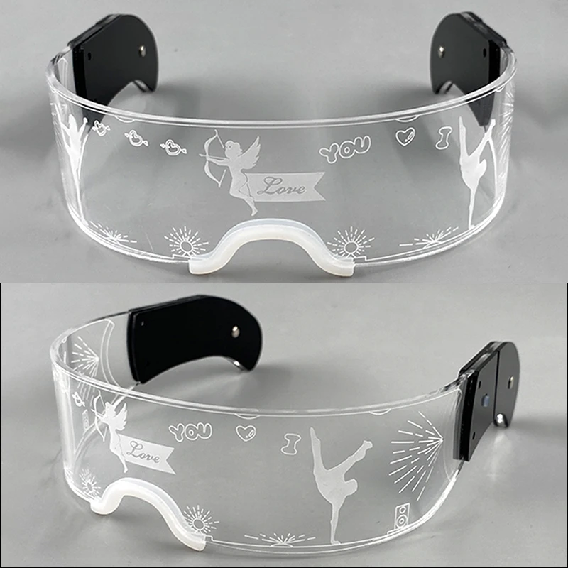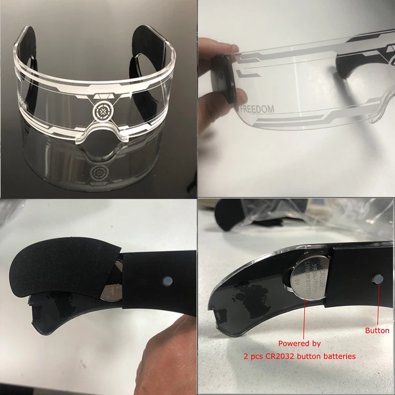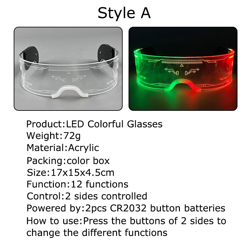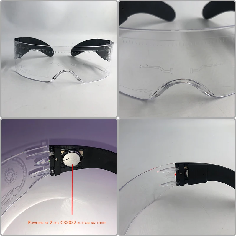 2.Selecione o modo de iluminação: Os óculos LED são controlados nos dois lados.Pressione o botão preto na lateral e, cada vez que pressioná-lo, os LEDs mudarão entre os 12 modos de iluminação abaixo: