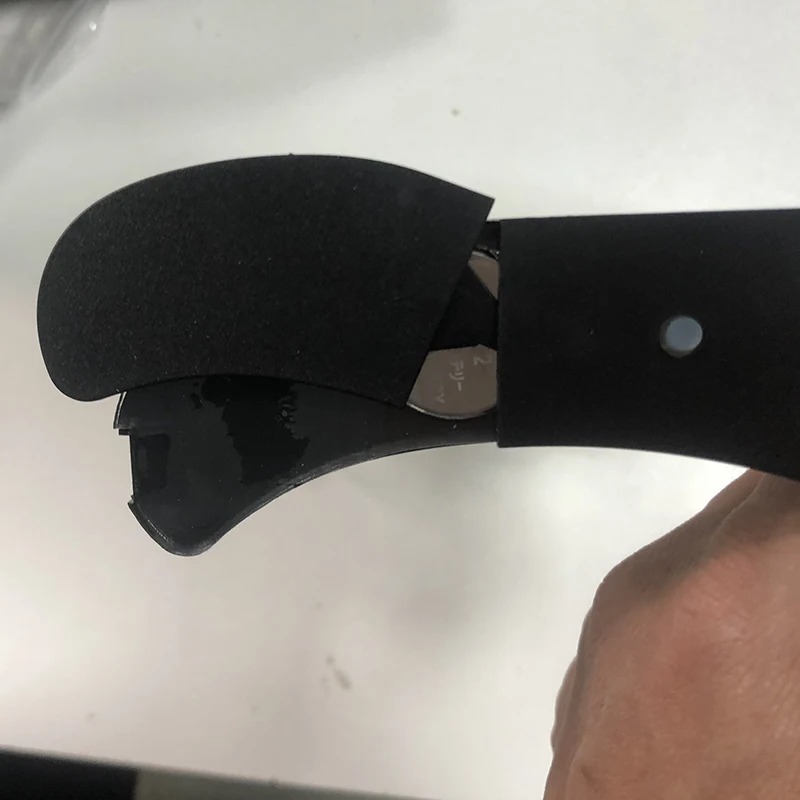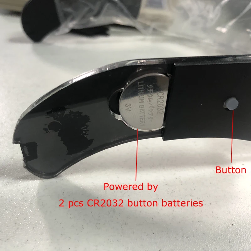 1.Coloque a bateria: Há um compartimento de bateria nos lados esquerdo e direito.Deslize a tampa da bateria para trás para abri-la e coloque 1 bateria de botão CR2032 em cada compartimento.A bateria é colocada com o eletrodo positivo voltado para fora.Depois de colocar a bateria, feche a tampa da bateria.