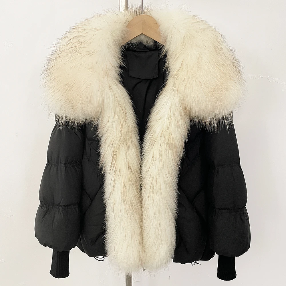- > Oftbuy grande jaqueta de pele de guaxinim real manga de malha pele real novo inverno puffer jaqueta feminina pato branco para baixo casaco de penas de grandes dimensões