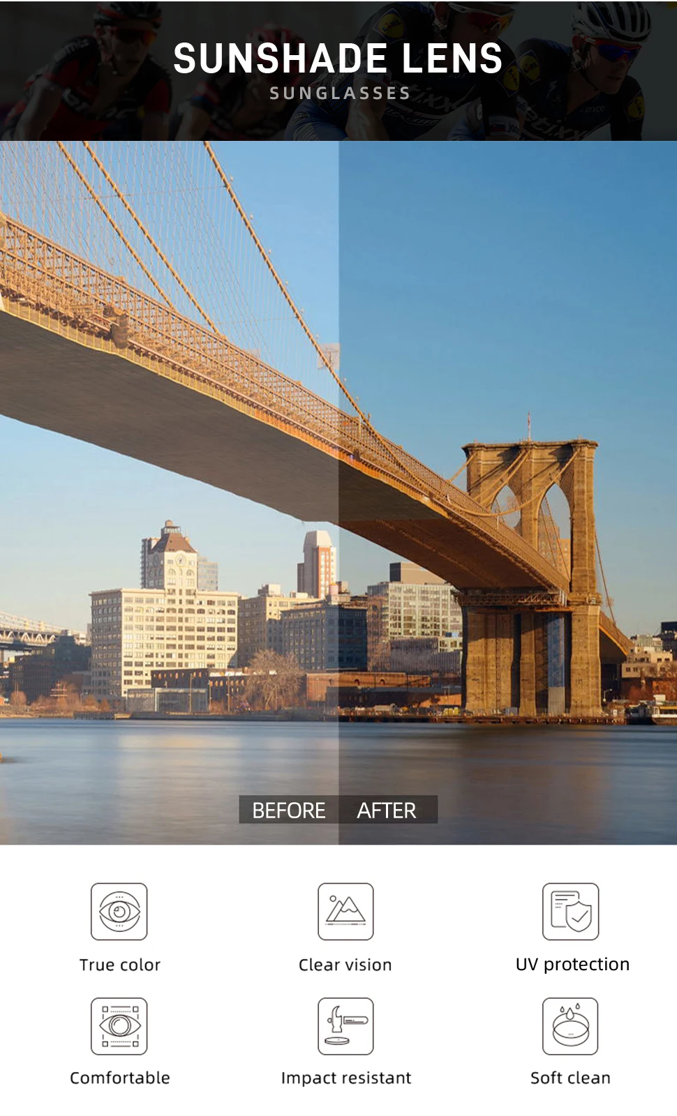 1.**100% de proteção UV** – Bloqueia os raios UVA/UVB prejudiciais para manter seus olhos seguros sob o sol.