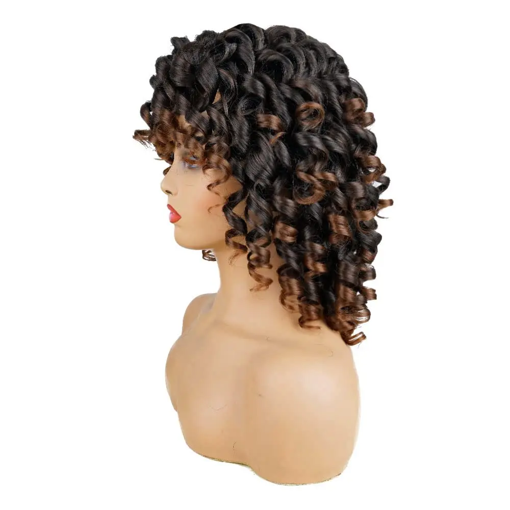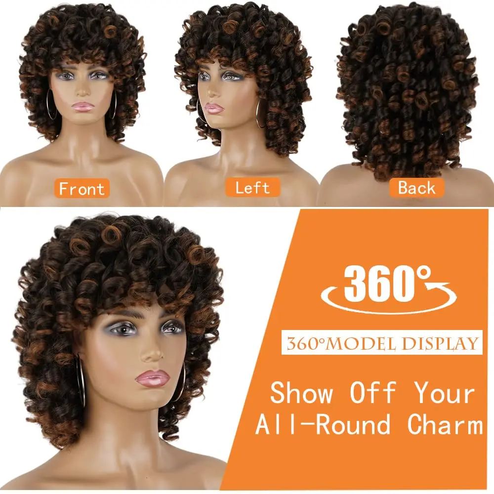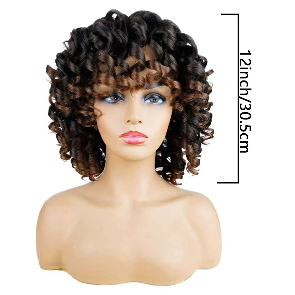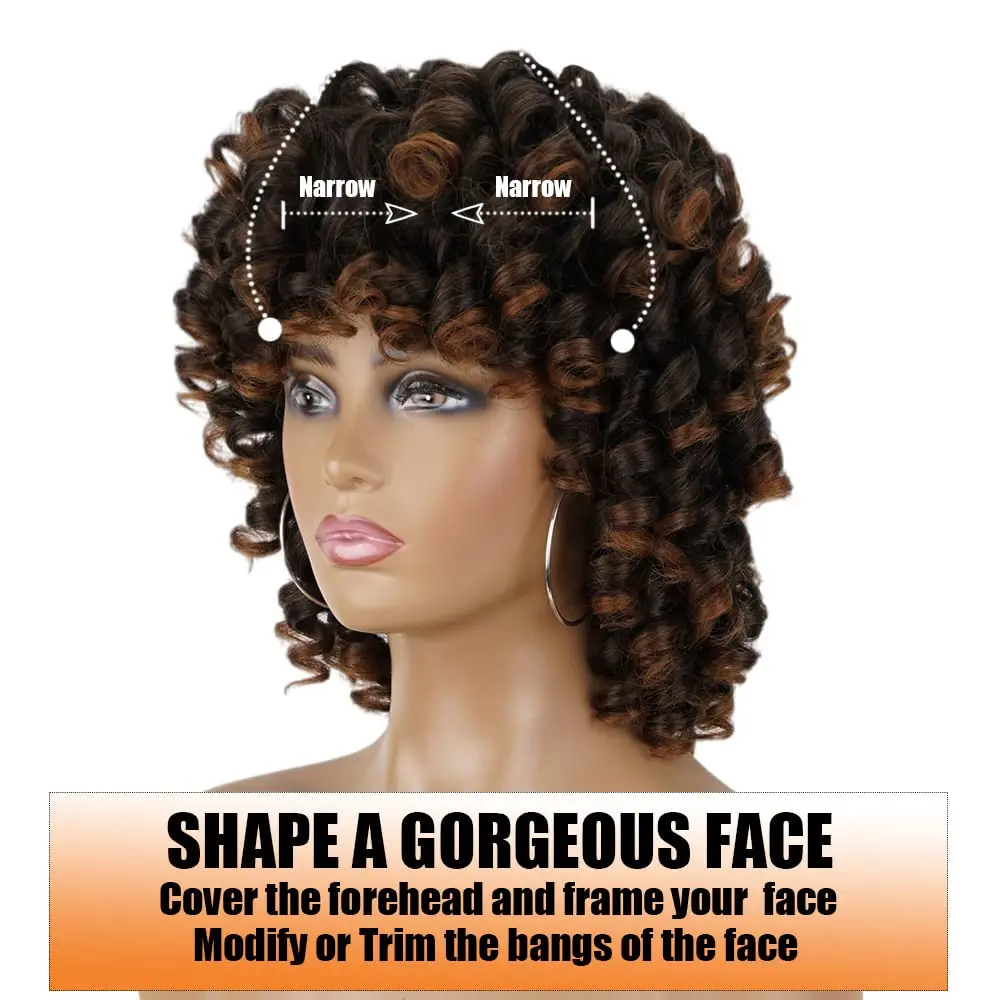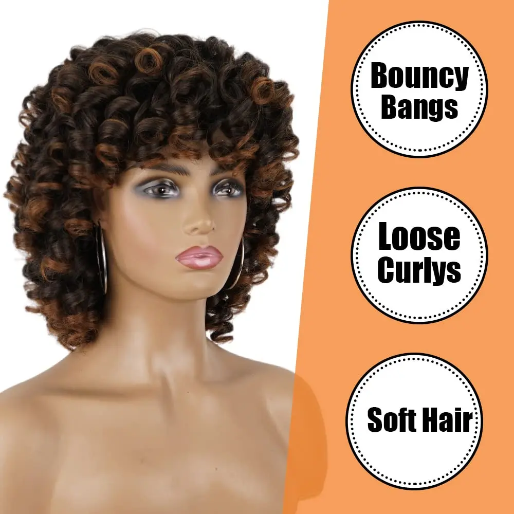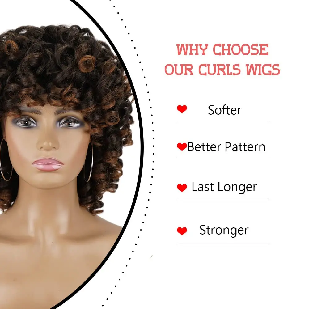 - > Ombre marrom encaracolado perucas para preto feminino curto encaracolado peruca com franja macio solto encaracolado perucas para mulheres fibra sintética cabelo sem cola