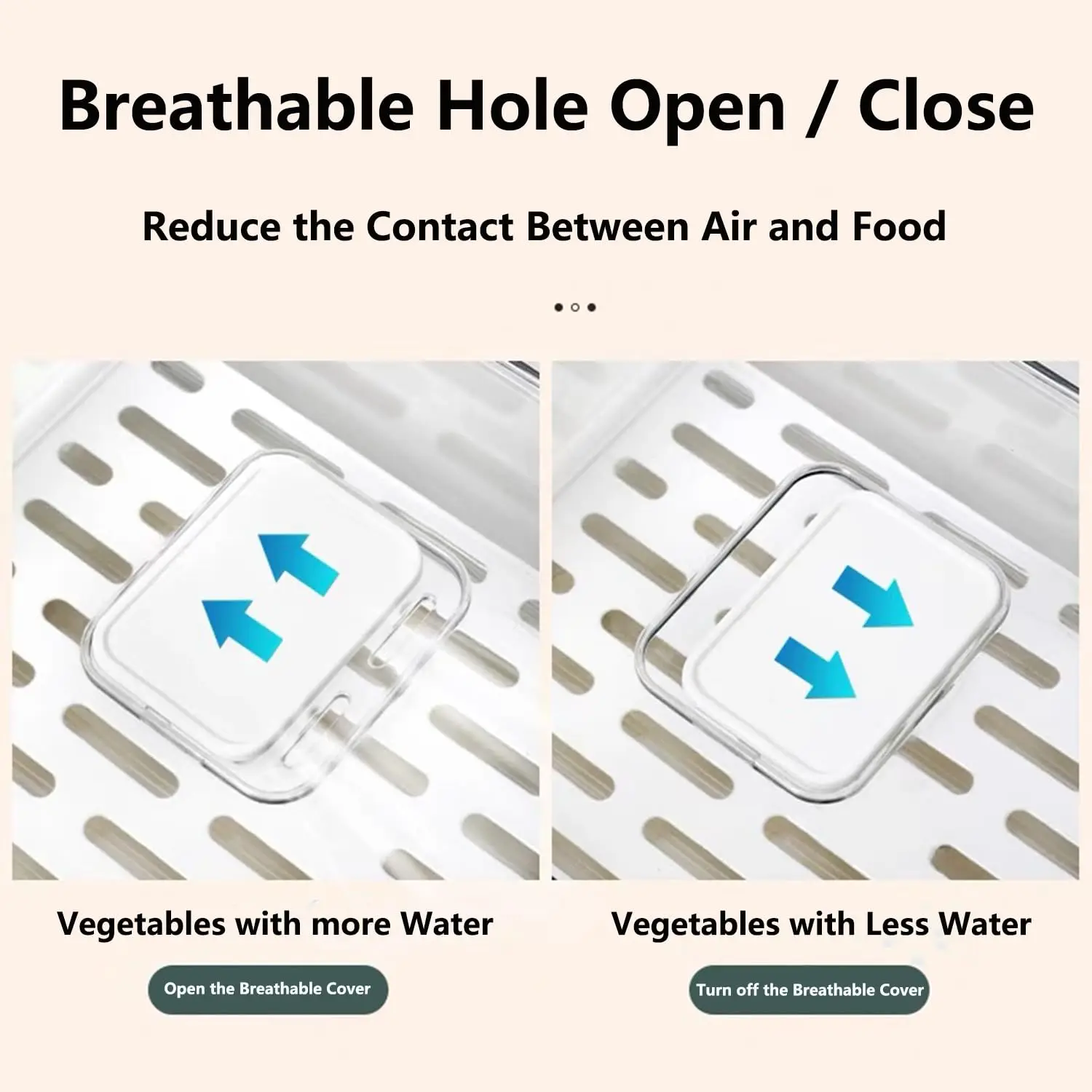 DESIGN HUMANIZADO:A placa de drenagem na parte inferior das caixas organizadoras da geladeira pode filtrar o excesso de água dos alimentos, evitar que os alimentos mergulhem em água e mantê-los frescos.Alça confortável em forma de S e cantos arredondados.Os orifícios de drenagem inferiores podem descarregar o excesso de água.As janelas de ventilação acima podem ser fechadas e abertas de forma flexível.