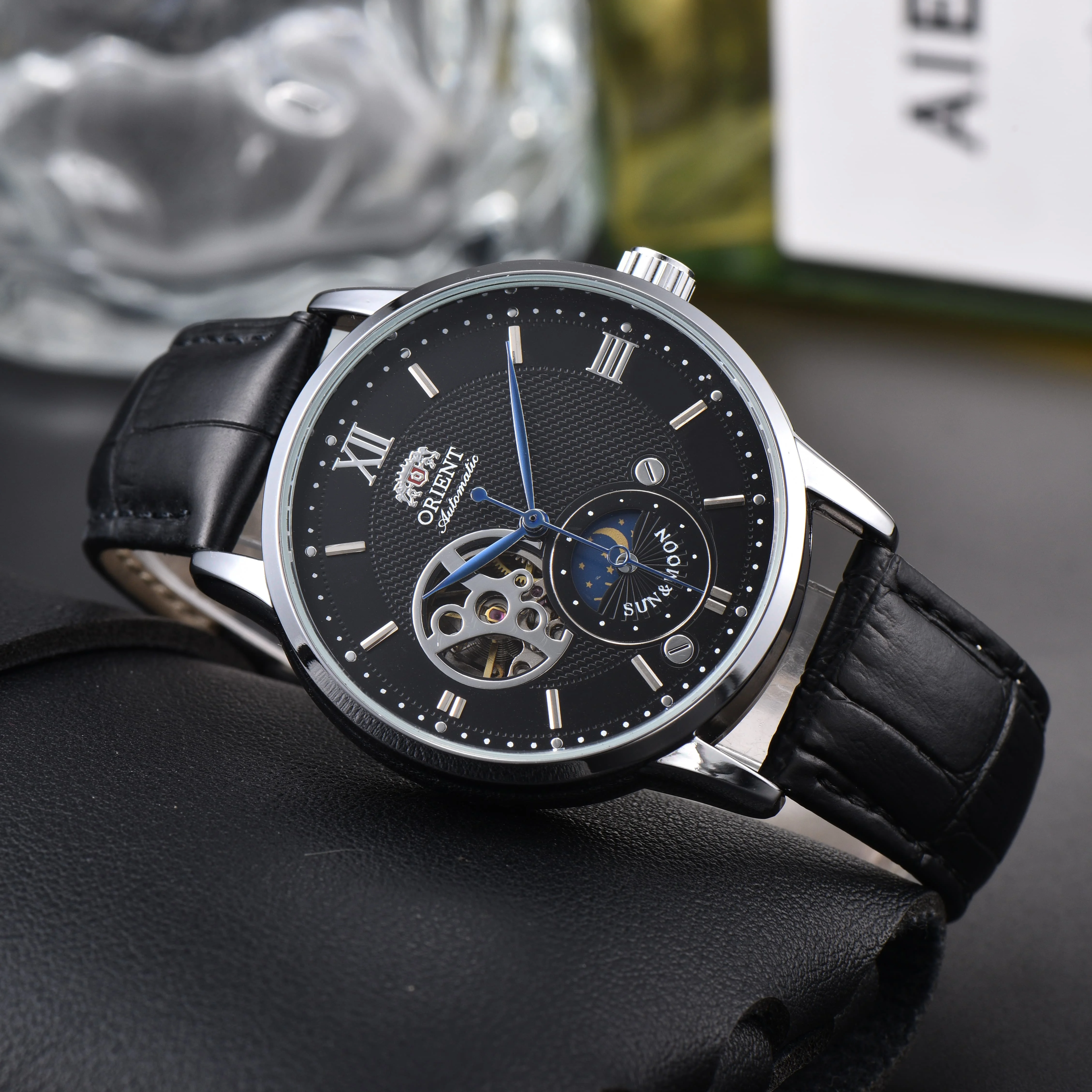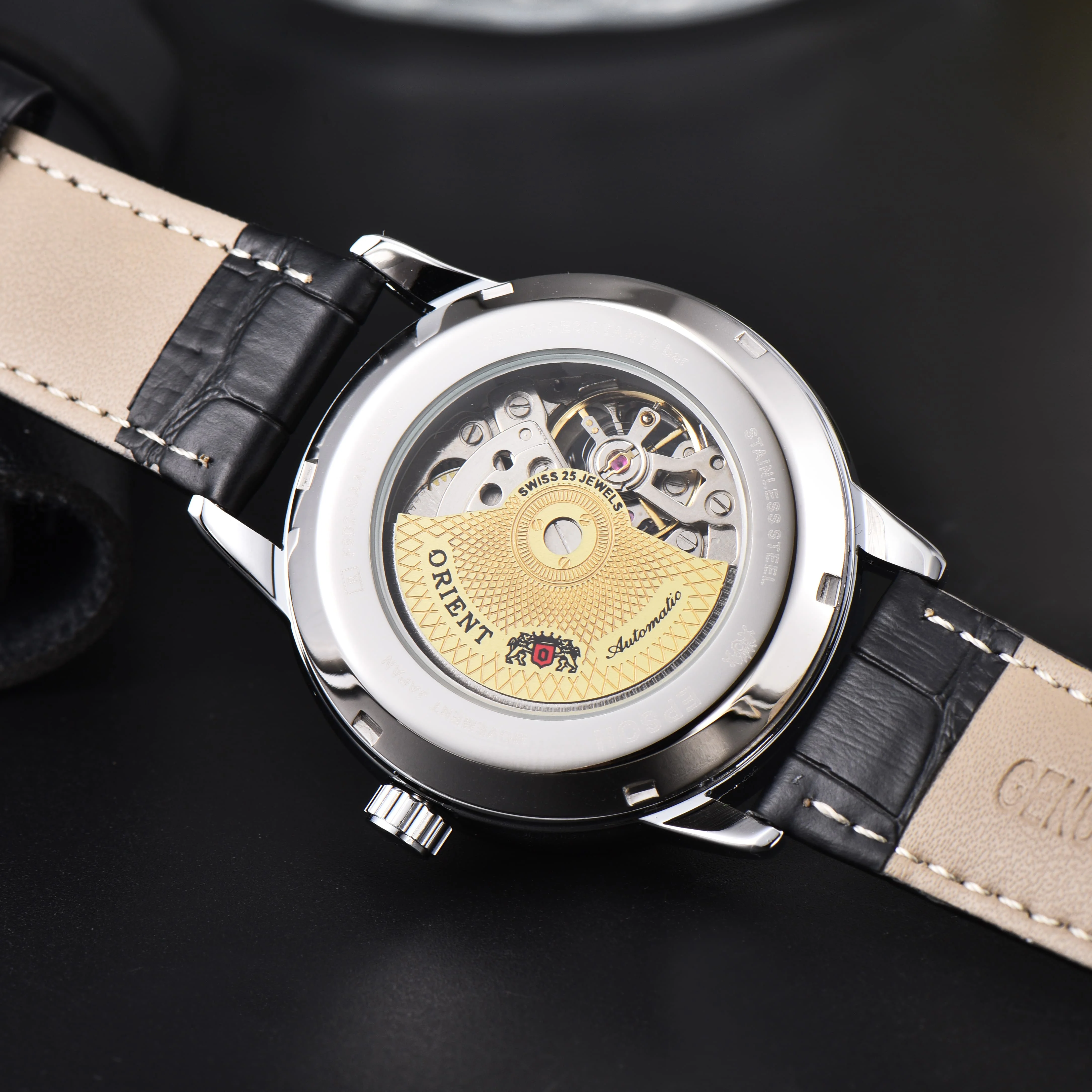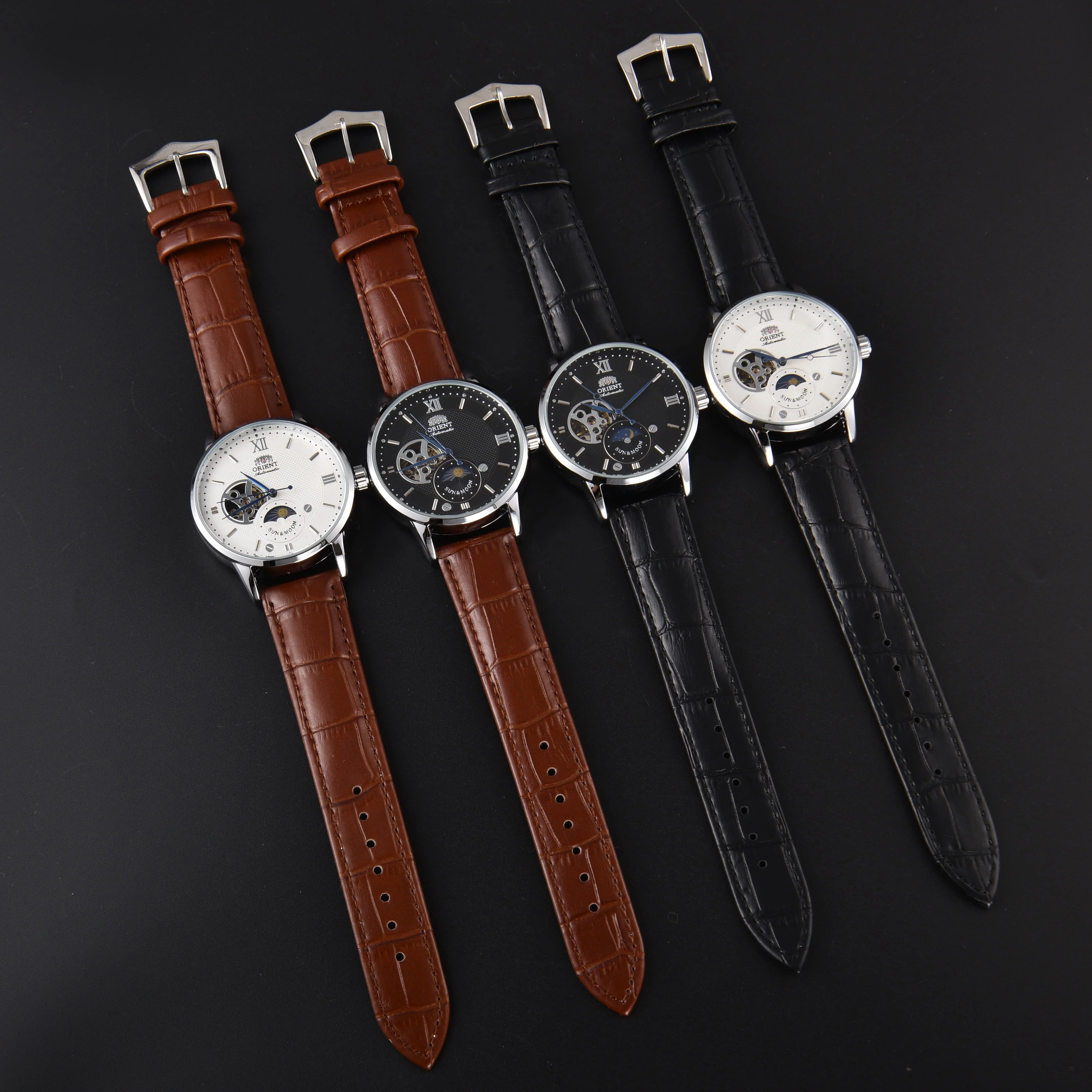 - > Orient sun & moon semi esqueleto relógio automático masculino mostrador branco pulseira de couro preto cristal safira 50m à prova dwaterproof água vestido relógio