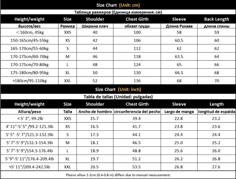 Alerta caloroso: o tamanho é próximo ao tamanho dos EUA, maior que o tamanho asiático.Selecione seu tamanho de acordo com a tabela de tamanhos acima.Certifique-se de que o peito da jaqueta seja pelo menos 20 cm (7,8 pol.) maior que o peito.:)