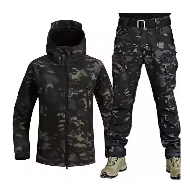 Outono inverno dos homens softshell velo jaquetas à prova dwaterproof água masculino casacos de capuz pesca caminhadas acampamento escalada calças esqui