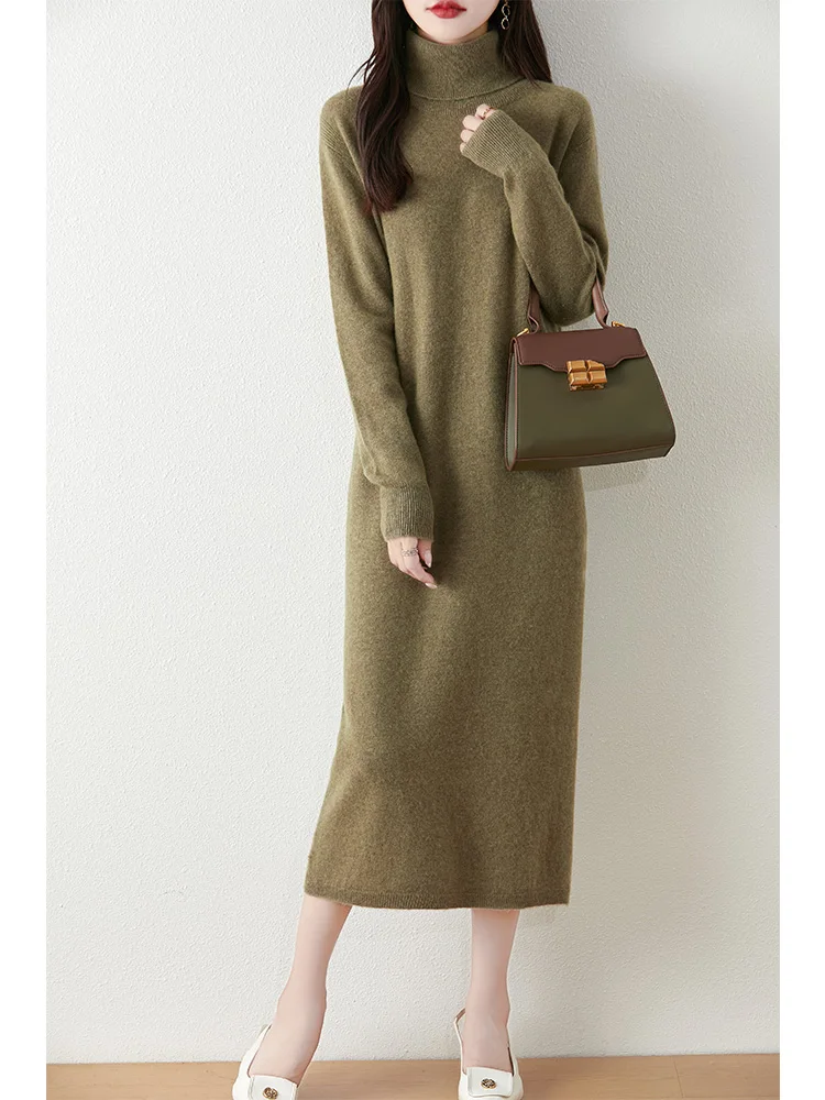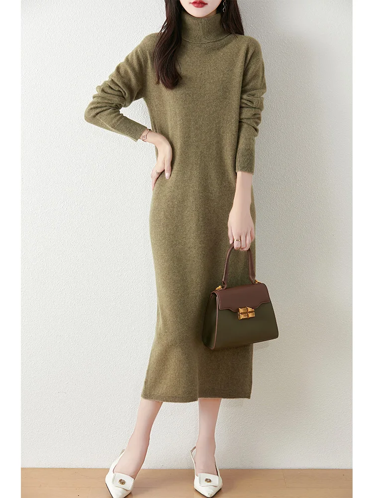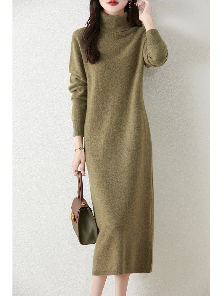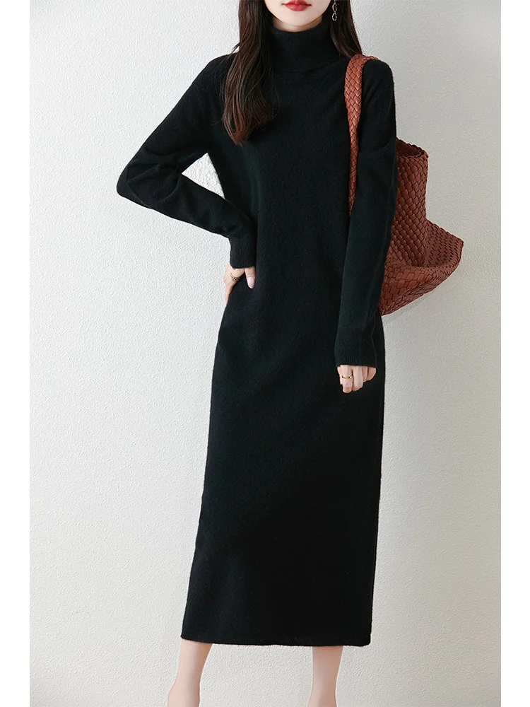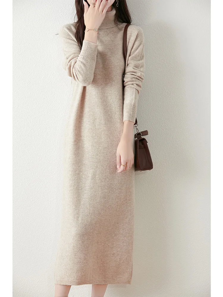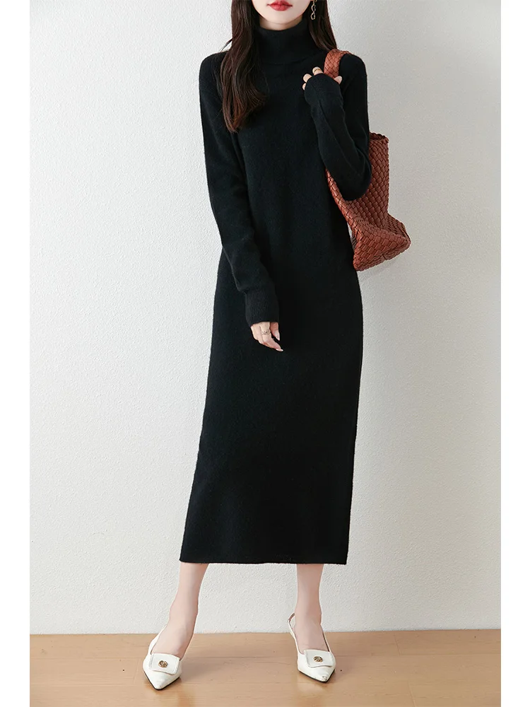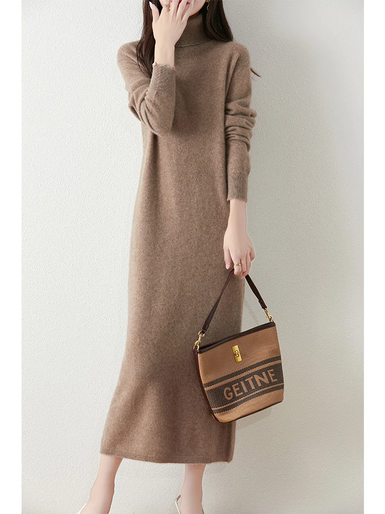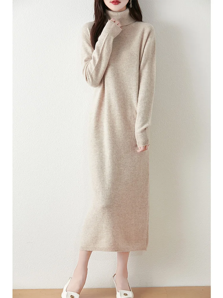 Outono inverno feminino gola alta camisola de lã vestido básico pulôver casual saia de caxemira 100% lã merino malhas roupas macias