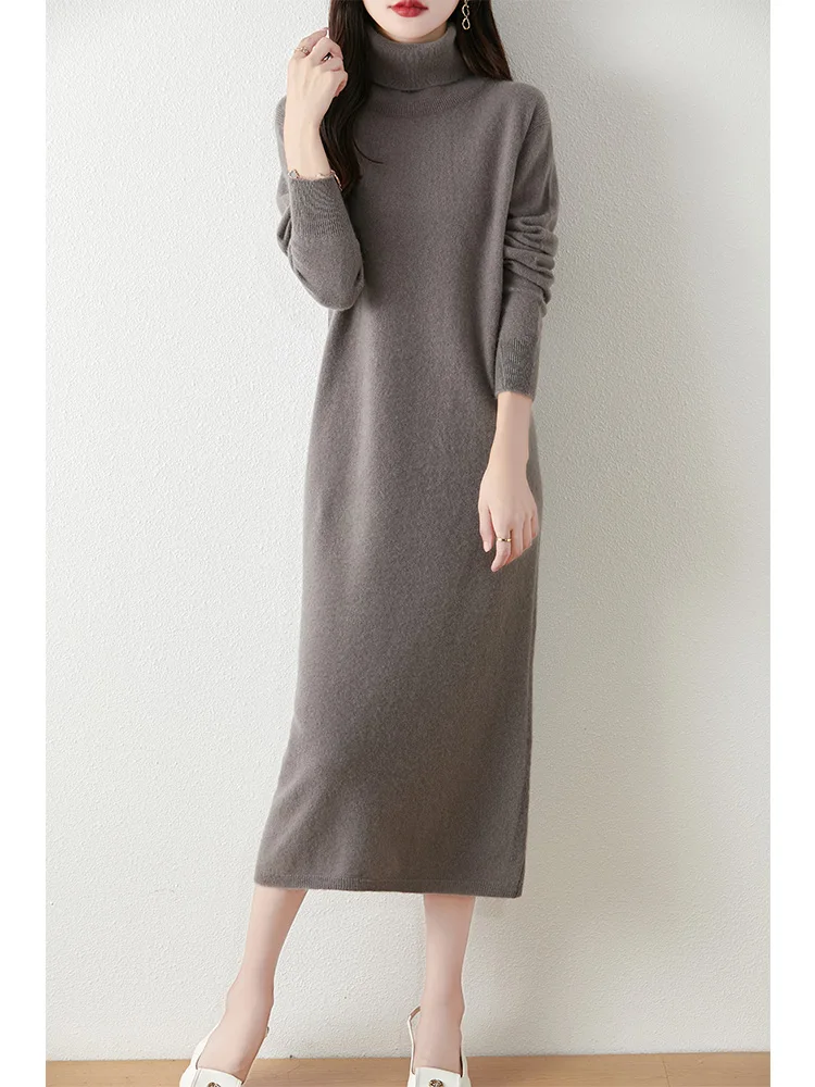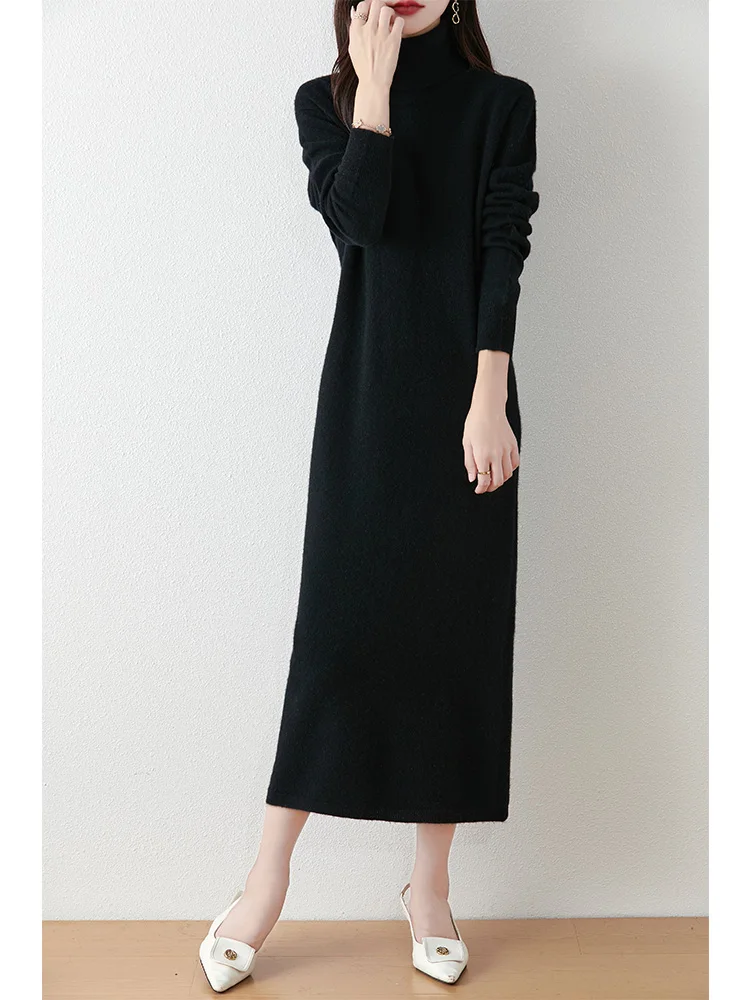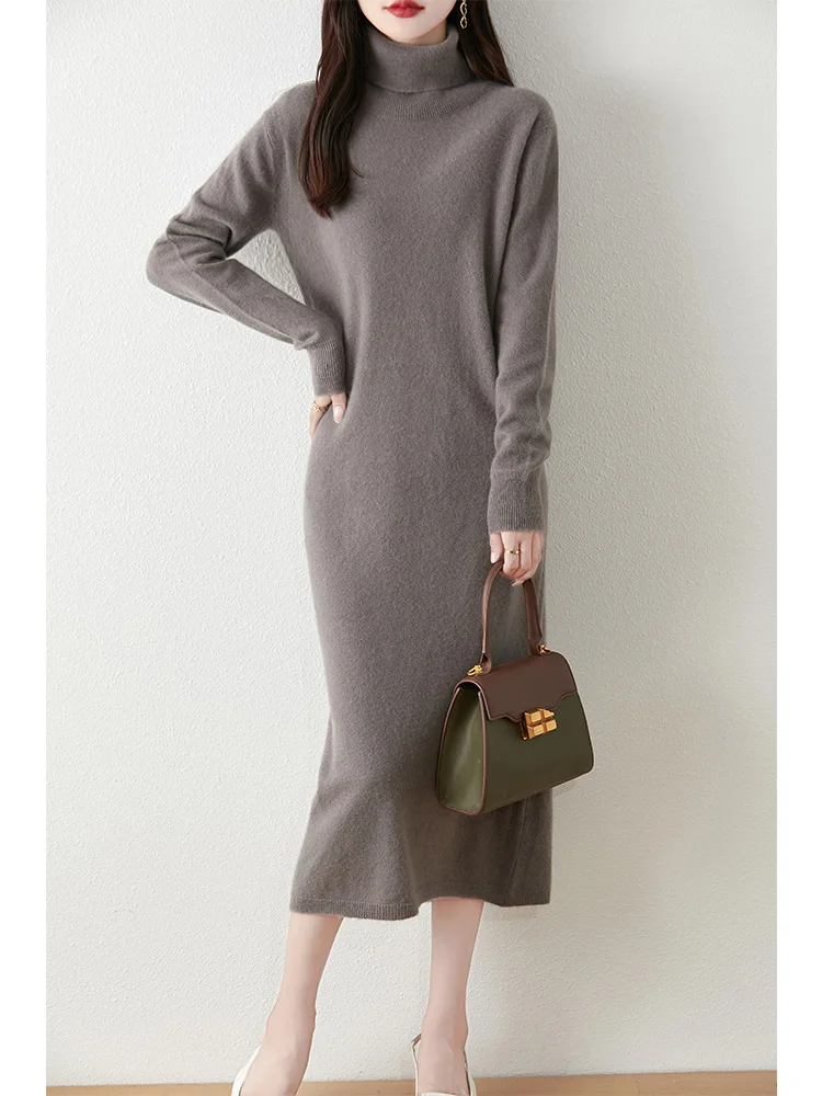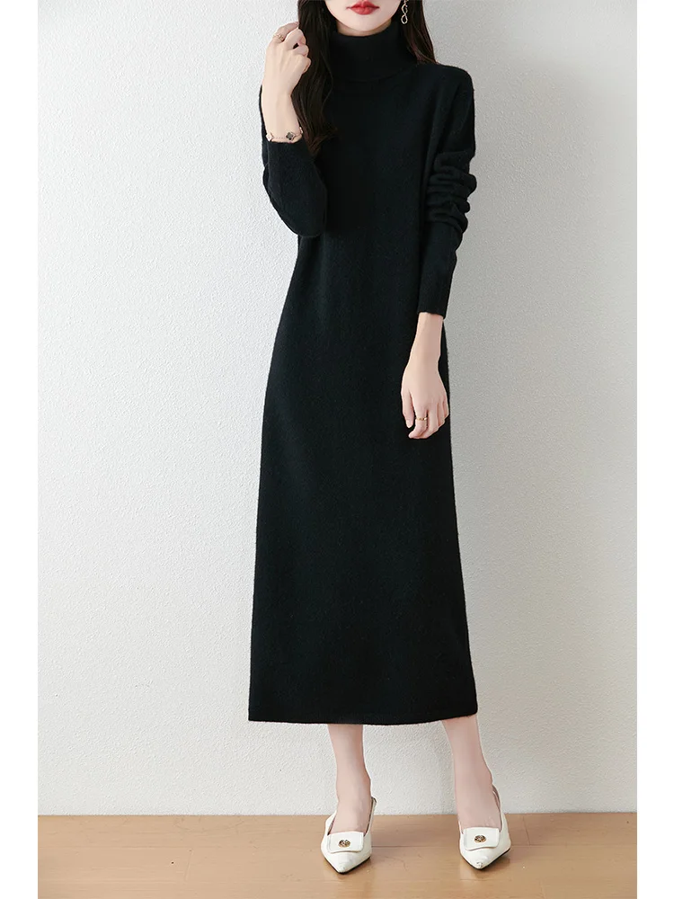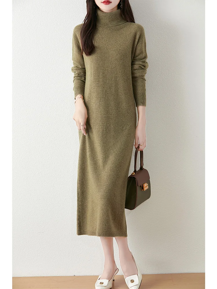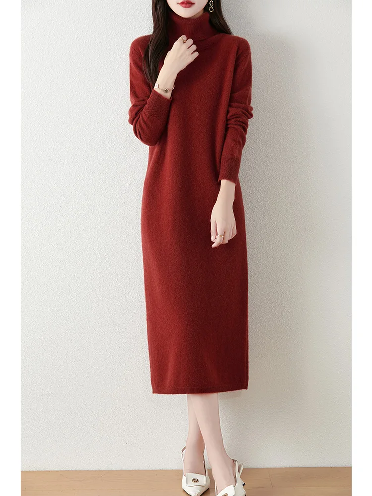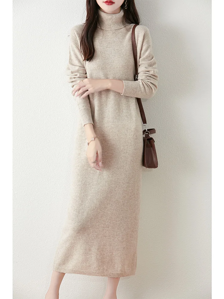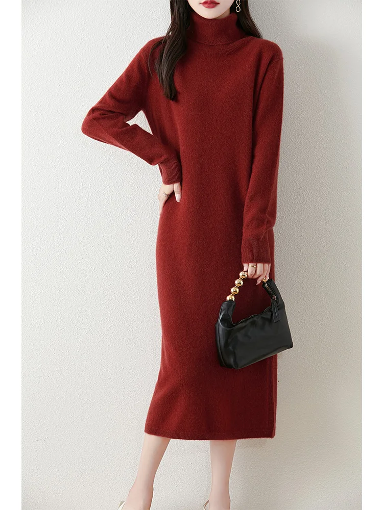 Outono inverno feminino gola alta camisola de lã vestido básico pulôver casual saia de caxemira 100% lã merino malhas roupas macias
