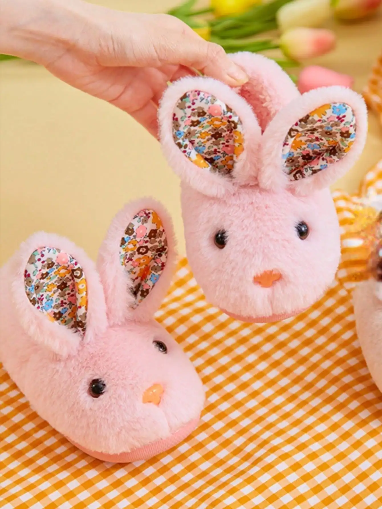 Para outono e inverno, meninas e meninos usam sapatos de algodão de coelho para calor e chinelos peludos internos
