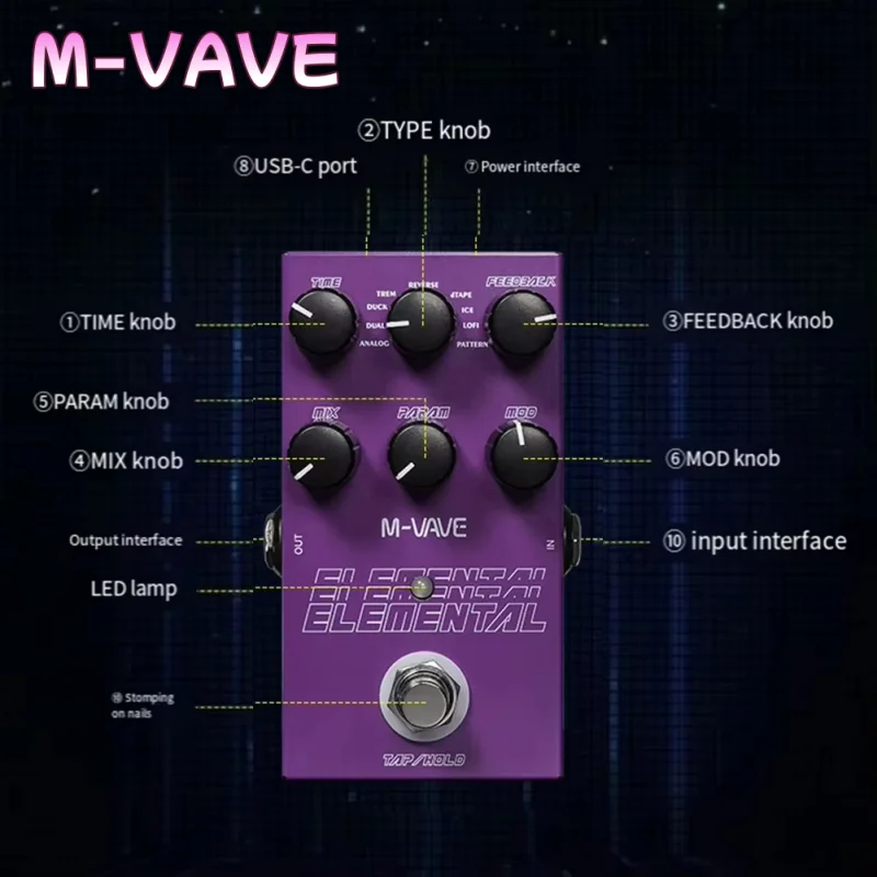 - > Pedal de Guitarra M-VAVE Elemental Digital Delay, 9 Efeitos de Amplificador Vintage, EQ de 3 Bandas, True Bypass com Modo Profissional TAP/HOLD