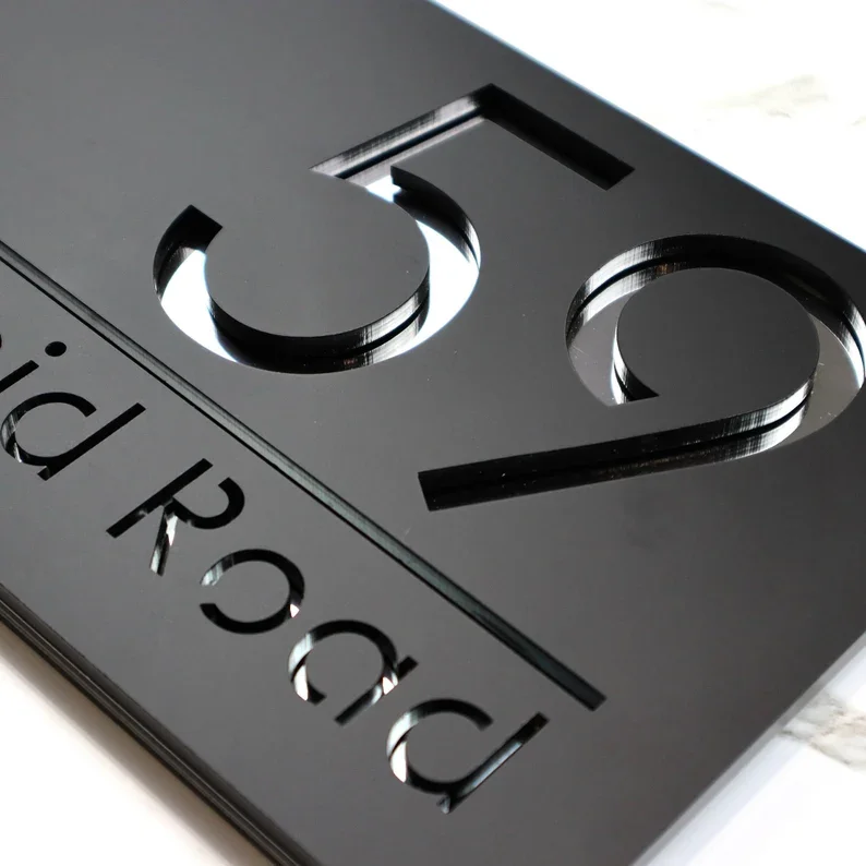 1.Estas incríveis placas de casa modernas são cortadas a laser em acrílico preto fosco com um deslumbrante verso em acrílico espelhado.