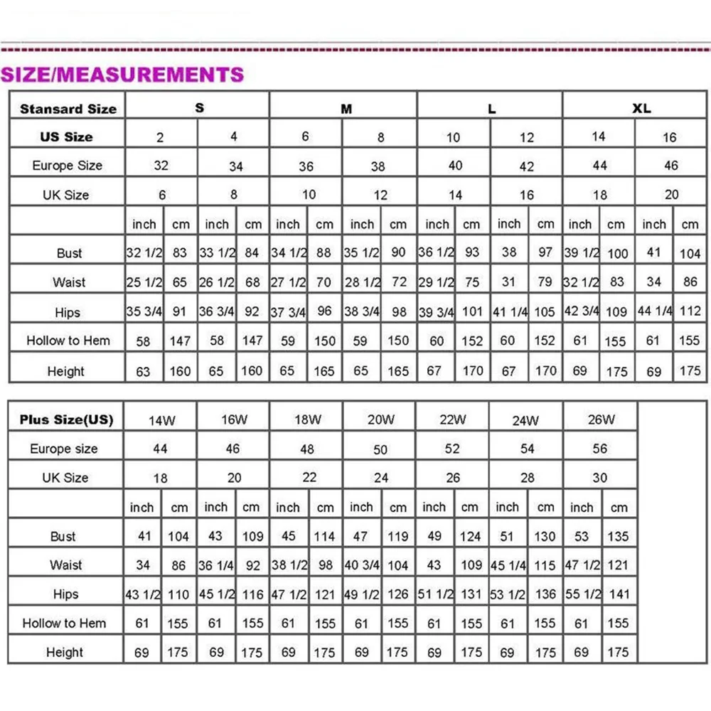 Se você conhece muito bem o tamanho do seu corpo e não é conveniente medi-lo novamente, você pode optar por encomendar seu vestido de noiva de acordo com o tamanho padrão.Verifique os dados detalhados e envie o pedido no tamanho mais próximo dos dados do tamanho do seu corpo.Se você escolher quaisquer parâmetros de tamanho que sejam significativamente diferentes da sua figura, entre em contato conosco a tempo.