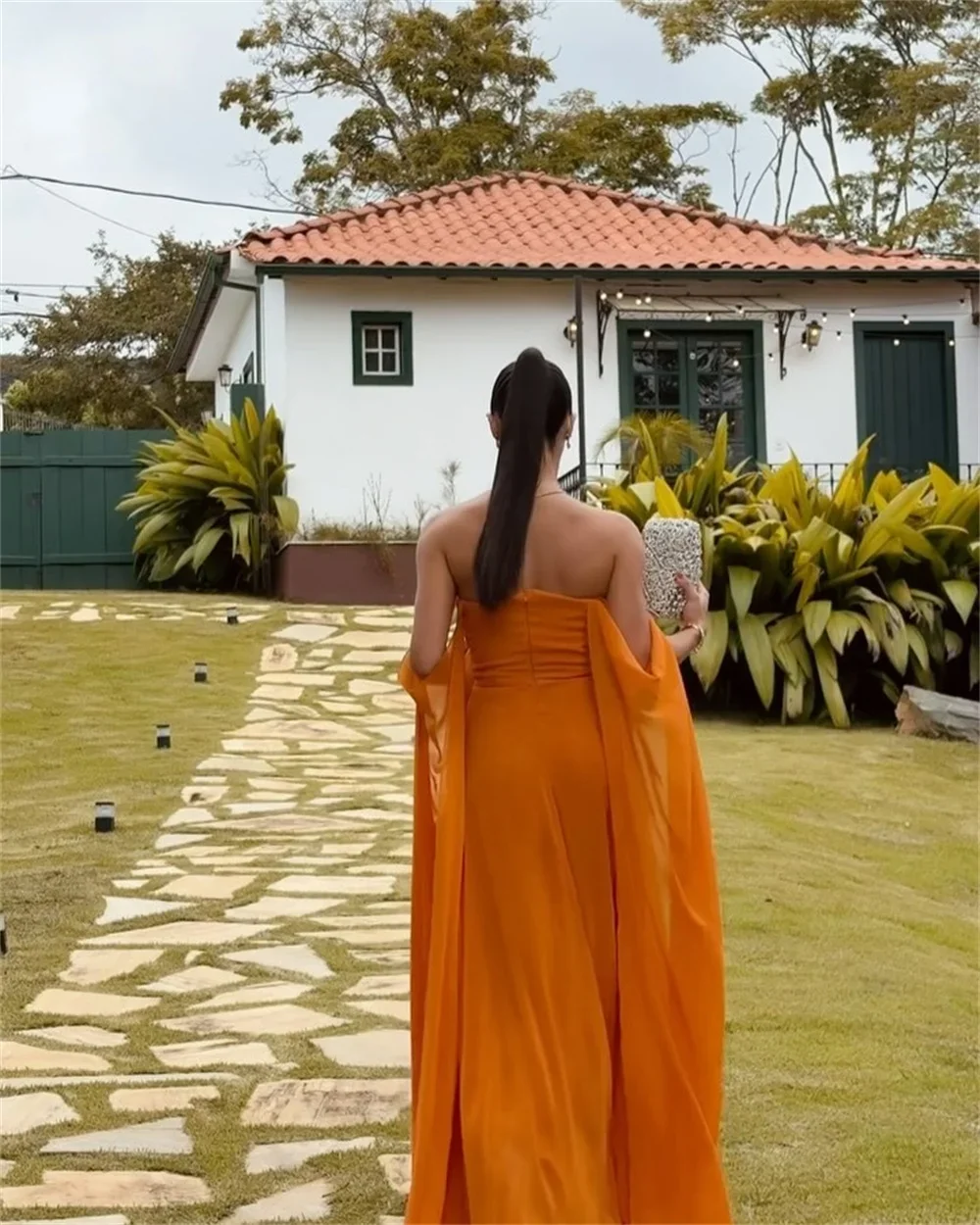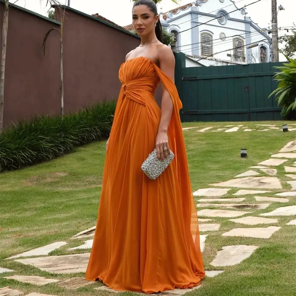 Personalizado laranja fora do ombro xale vestidos de baile sem mangas vestidos de noiva drapeado vestido de noite sem alças 2025