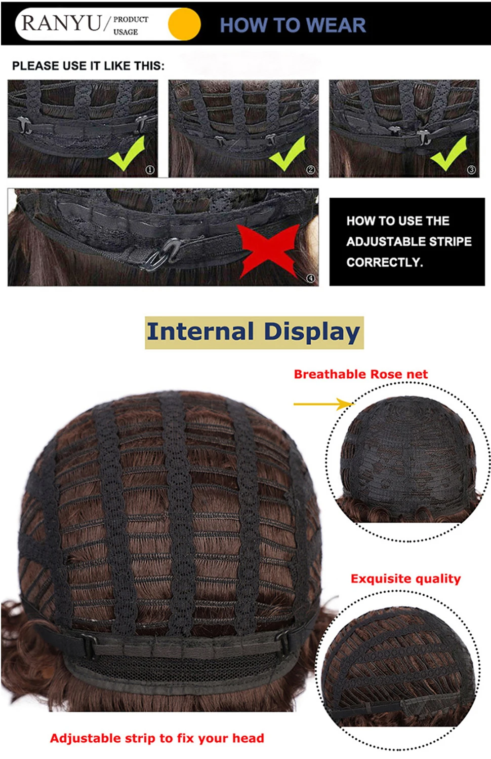A touca da peruca é ajustável, pode ser entrelaçada para se adequar a diferentes tamanhos de cabeça.
