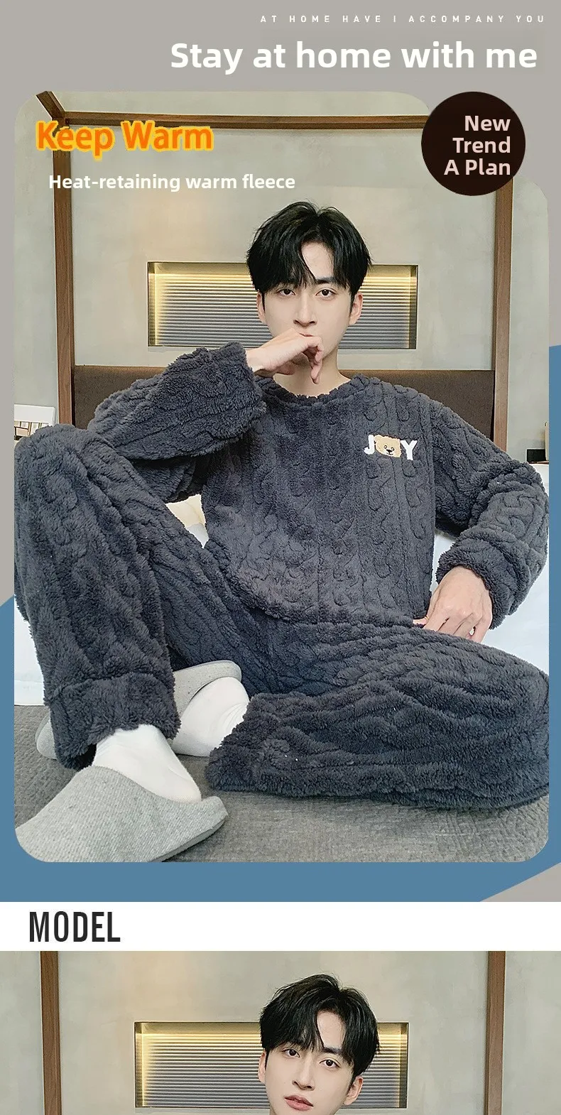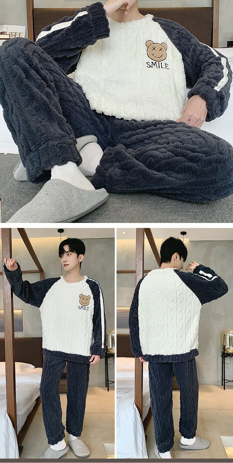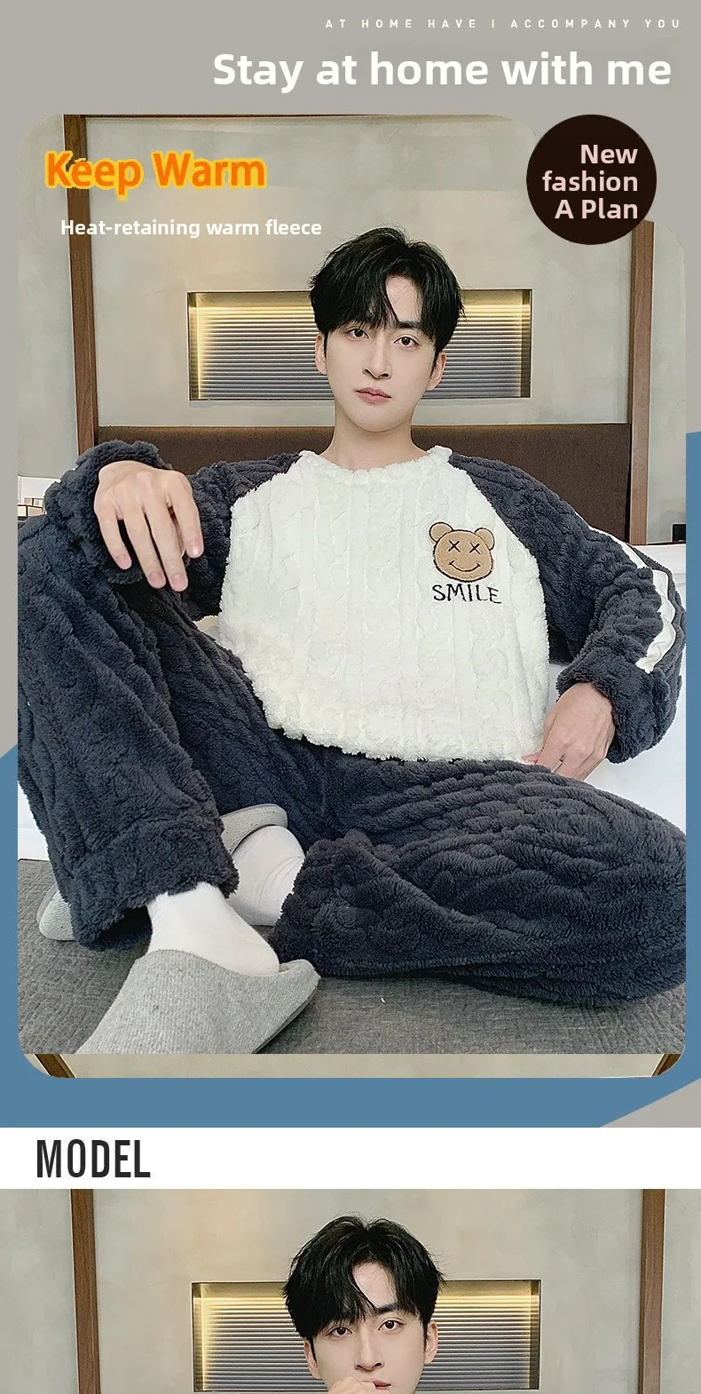 - > Pijamas de lã coral masculino engrossado outono inverno roupas para casa manga longa calças compridas confortáveis pijamas quentes design dos desenhos animados
