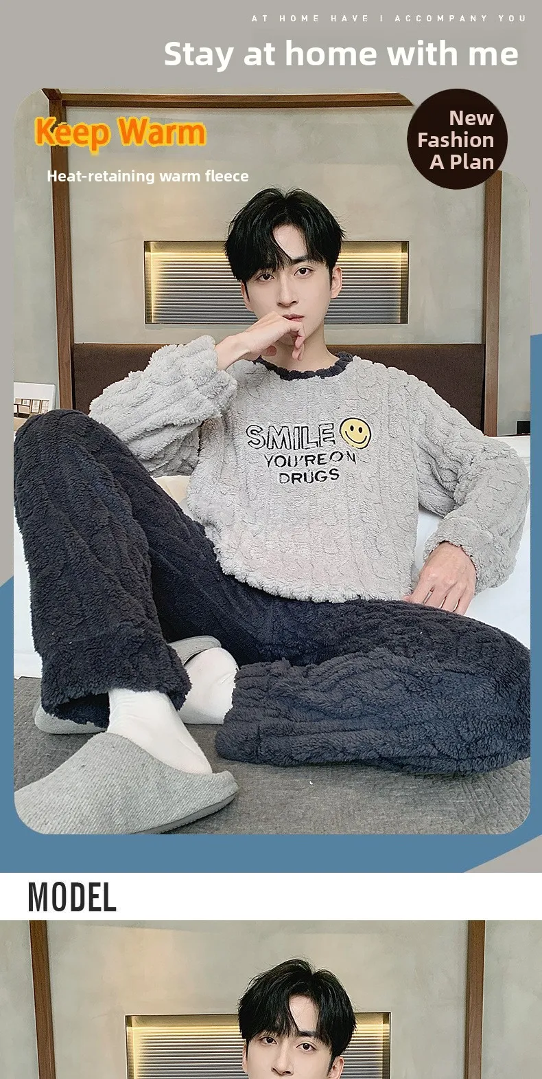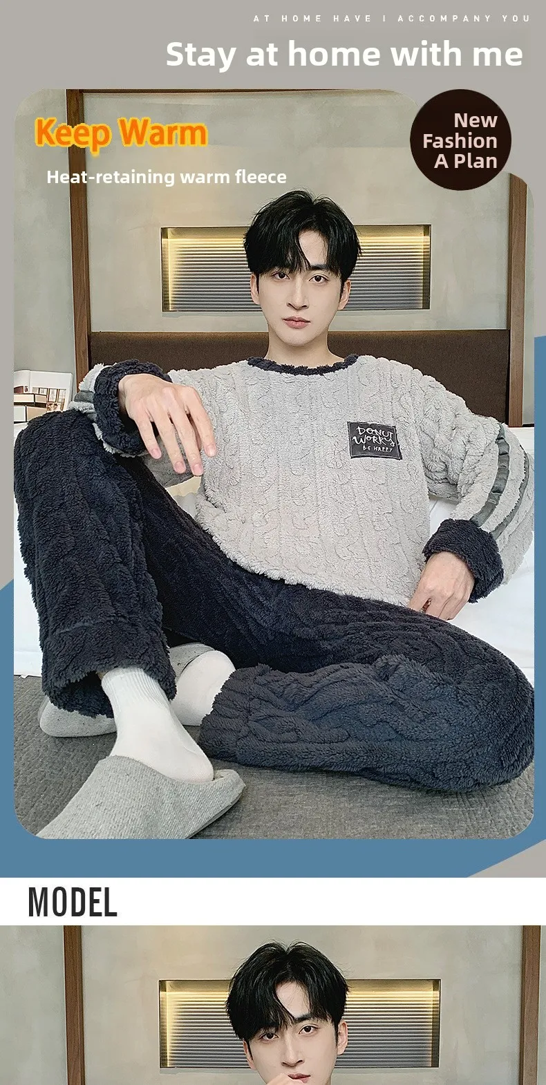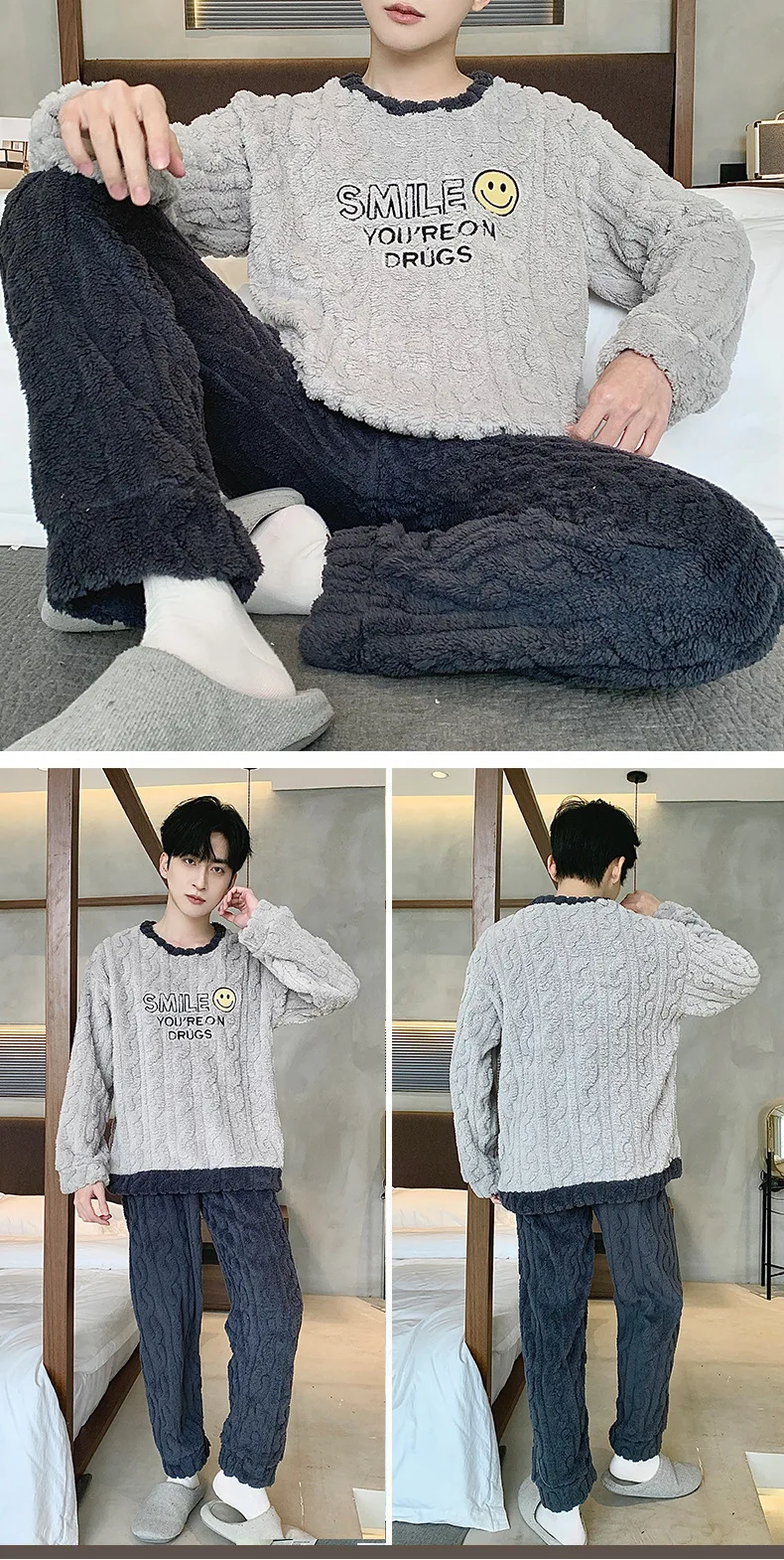 - > Pijamas de lã coral masculino engrossado outono inverno roupas para casa manga longa calças compridas confortáveis pijamas quentes design dos desenhos animados