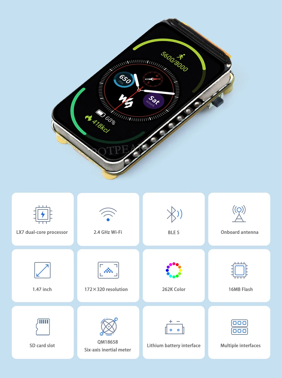 A unidade de medição inercial de seis eixos QMI8658 integrada (aceleração de 3 eixos, giroscópio de 3 eixos) pode detectar o status de deflexão do dispositivo, contagem de passos e outras funções