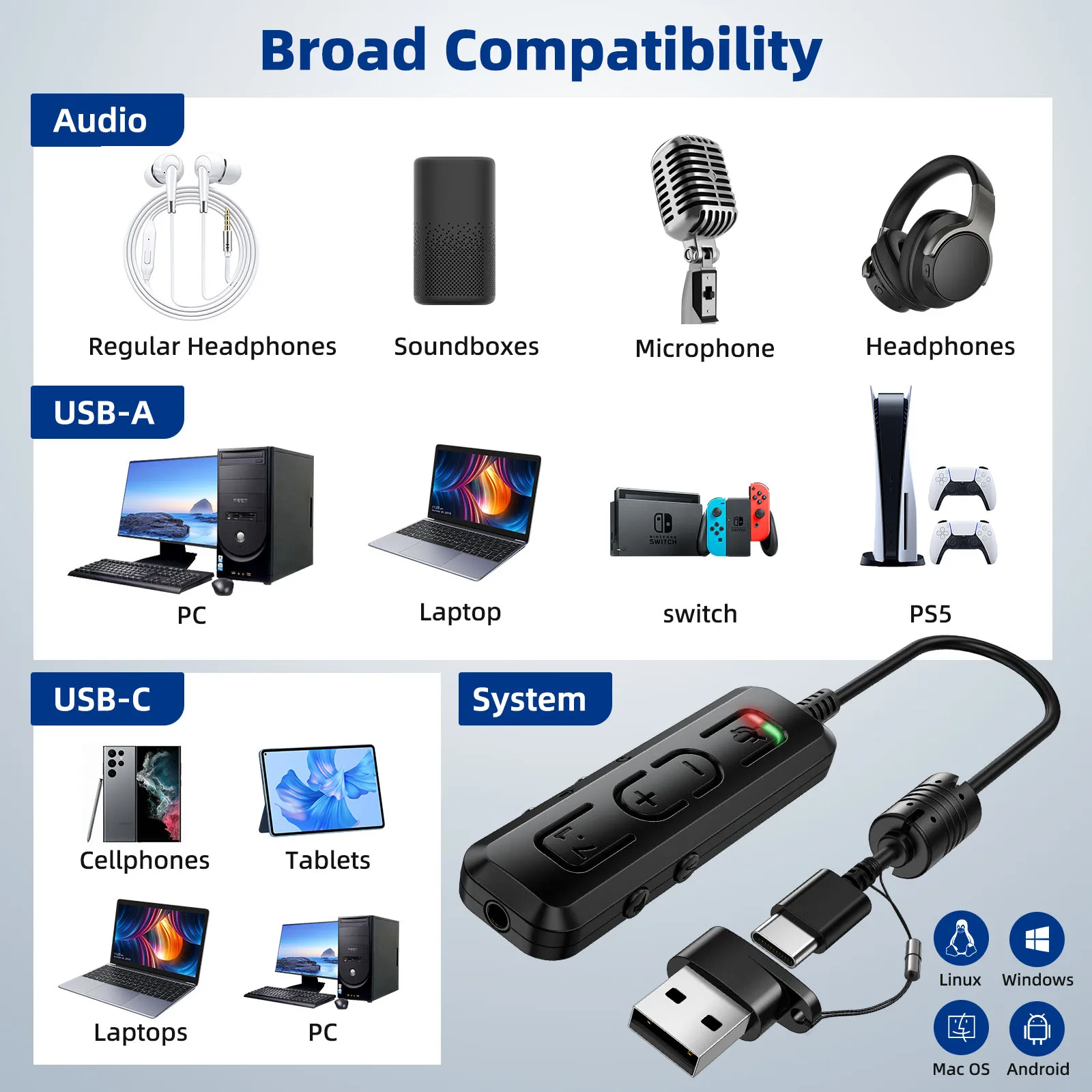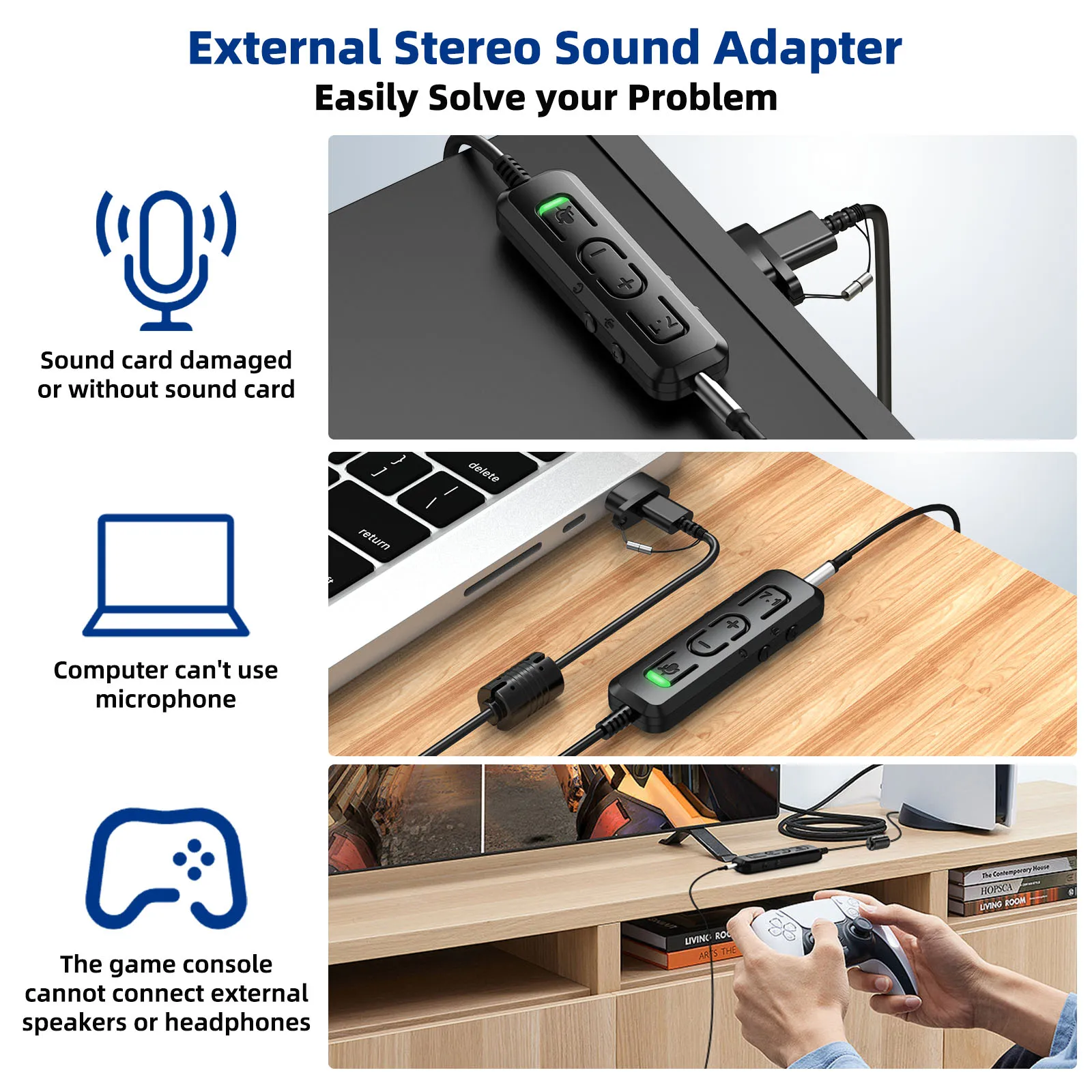 Special Feature 2: Multi Function Control: This USB sound card allows you to freely adjust the microphone and headset volume, and close the microphone during gameplay; if you are connected to a mobile phone, you can also play and switch music at will.