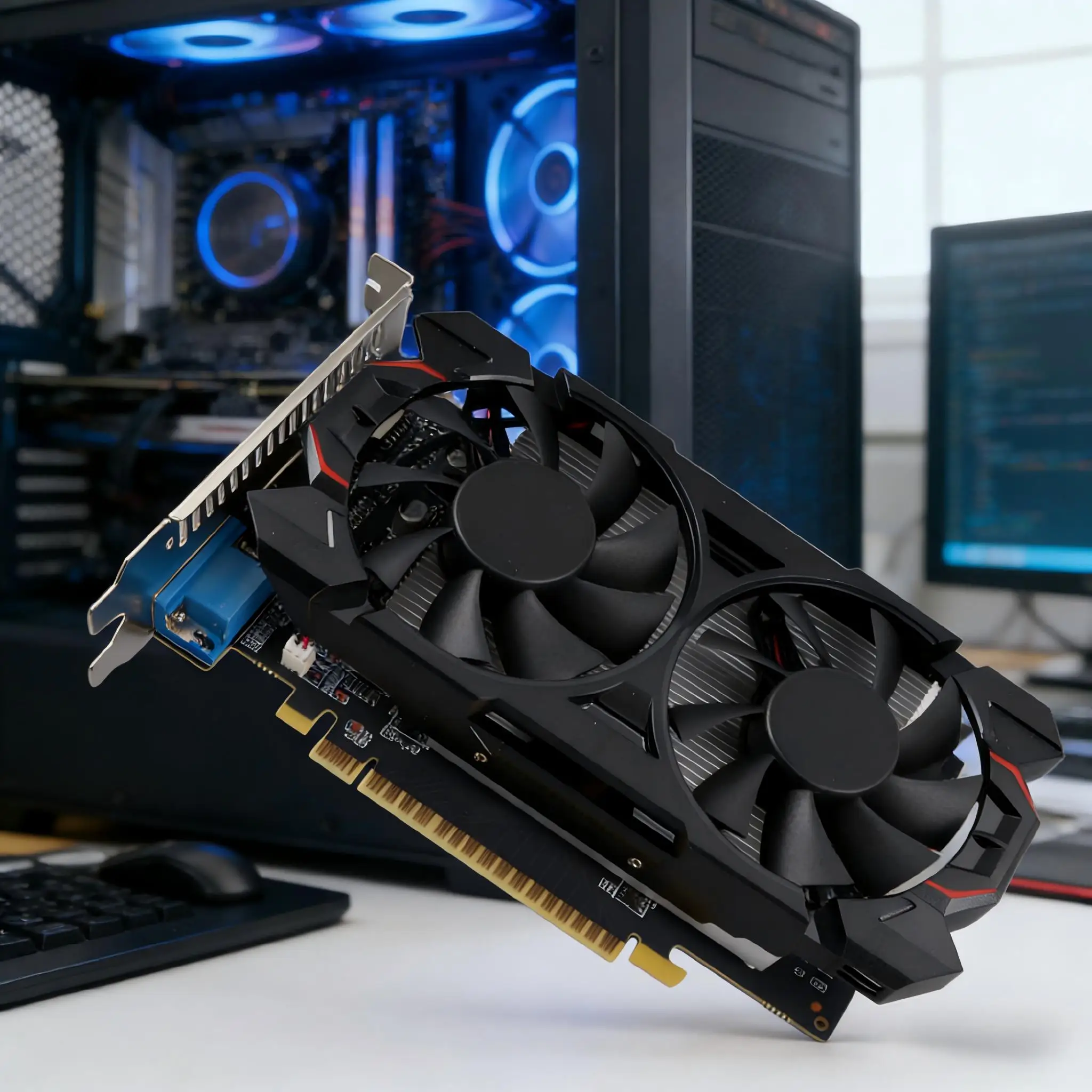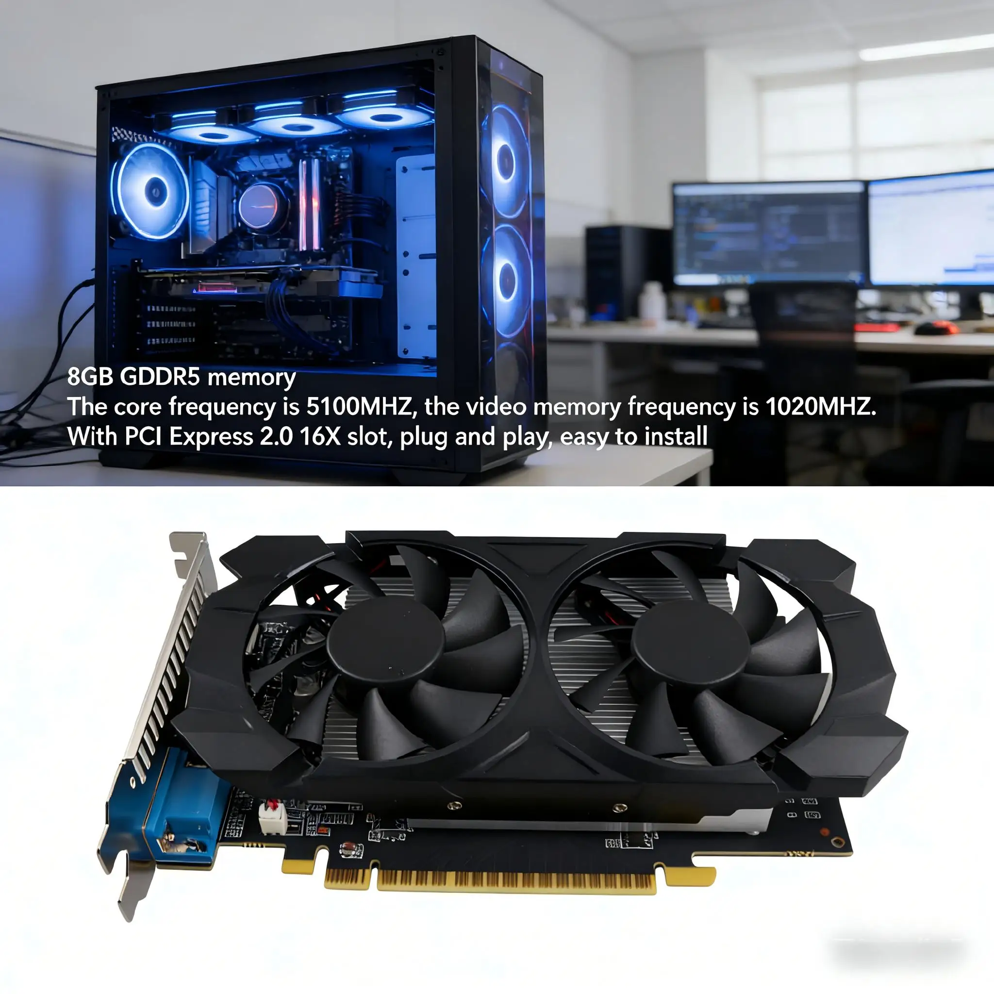 3.Fácil instalação: Apresentando um slot PCI Express 2.0 16X, a placa gráfica tem um tamanho compacto e é plug and play, facilitando a instalação.Seu desempenho superior e portabilidade tornam-no conveniente para transporte e armazenamento.