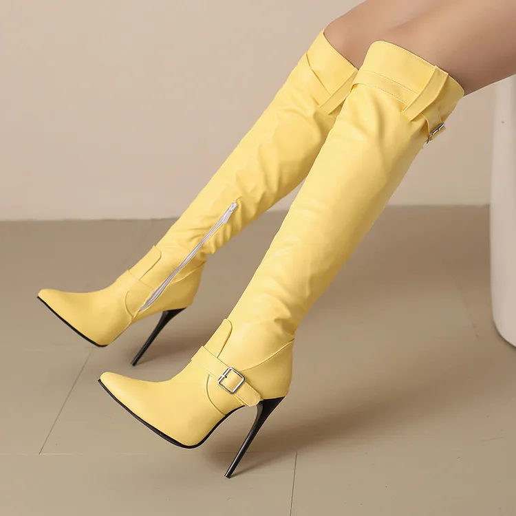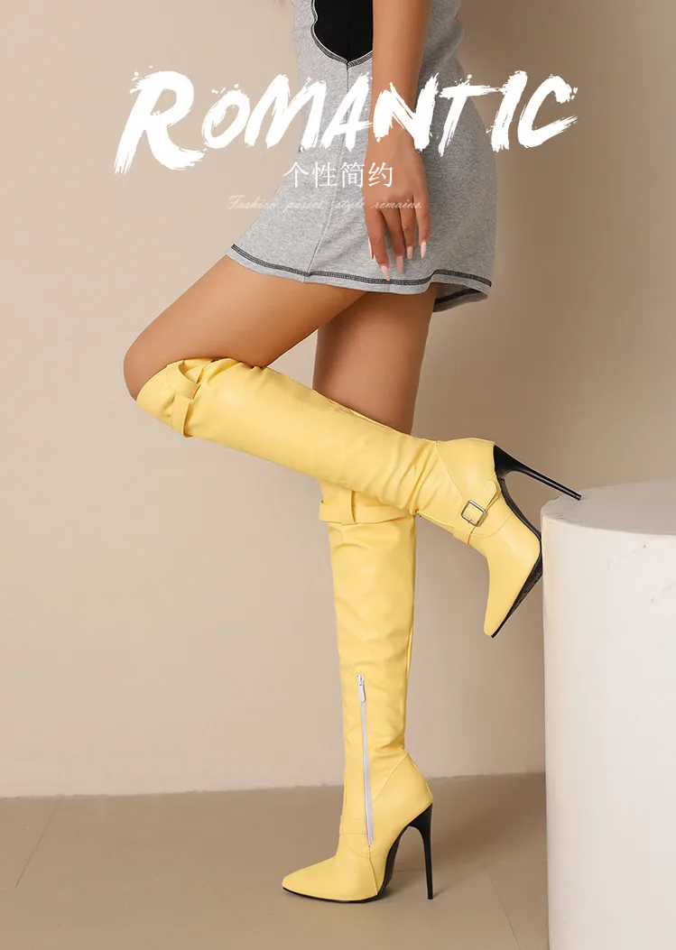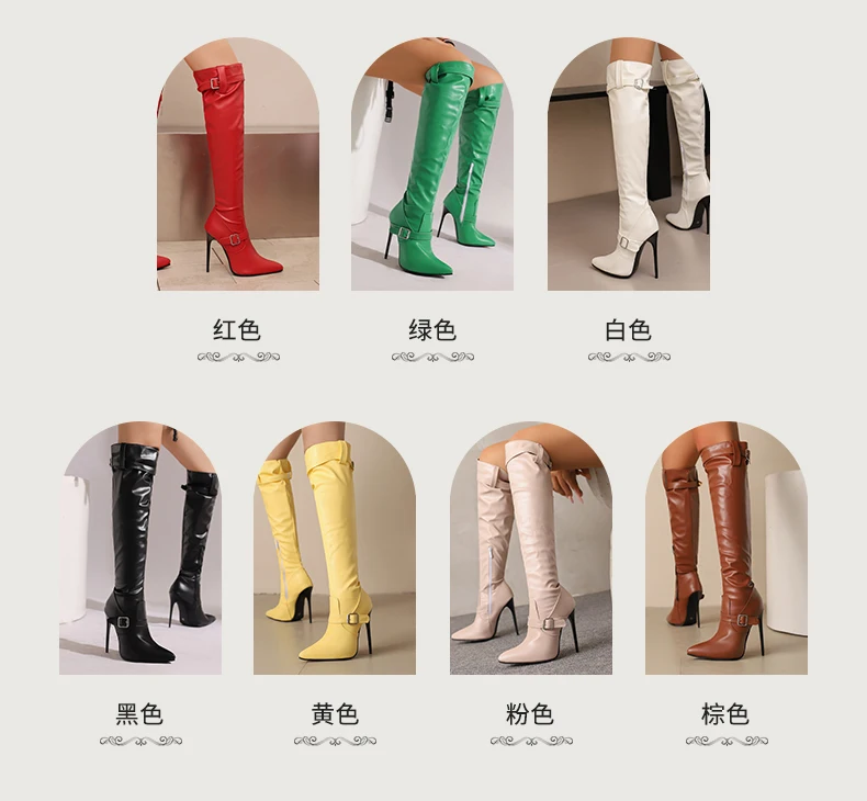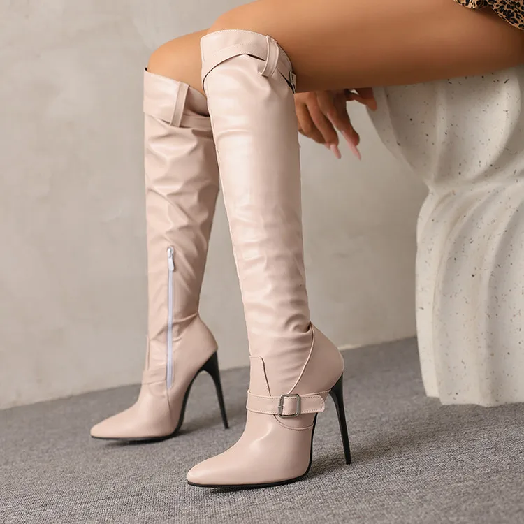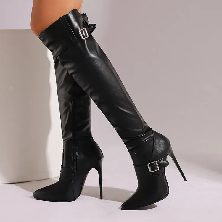 Plus size apontou ultra alto fino sexy outono novas botas longas com alças duplas fivela zíper lateral botas altas do joelho feminino