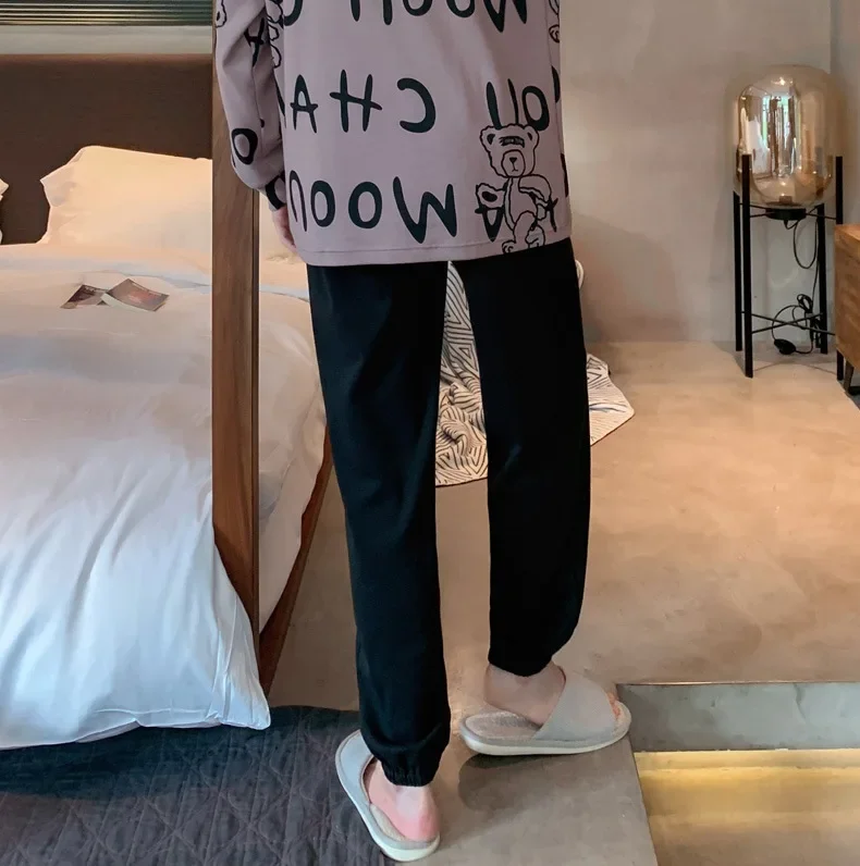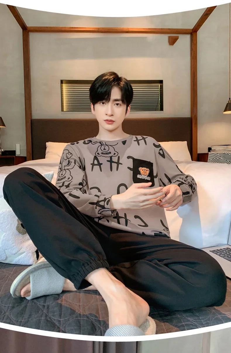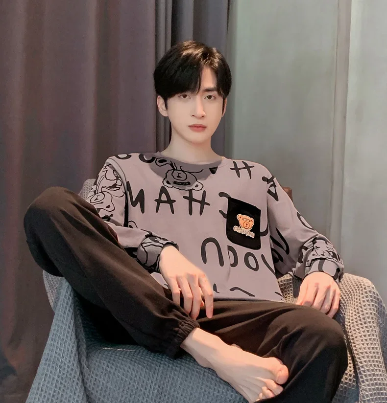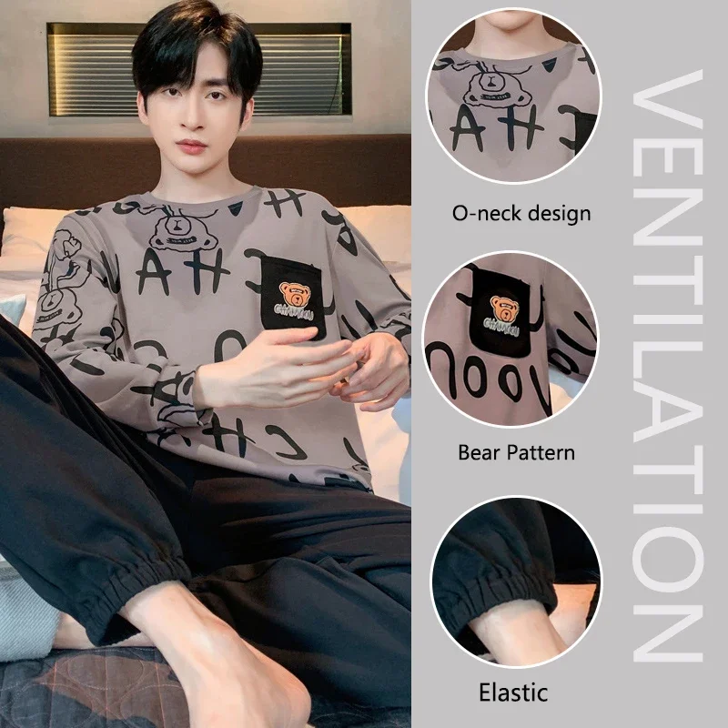 - > Plus size pijamas masculinos manga longa solto respirável cinza dos desenhos animados urso listras preto o-pescoço macio loungewear conjunto de duas peças