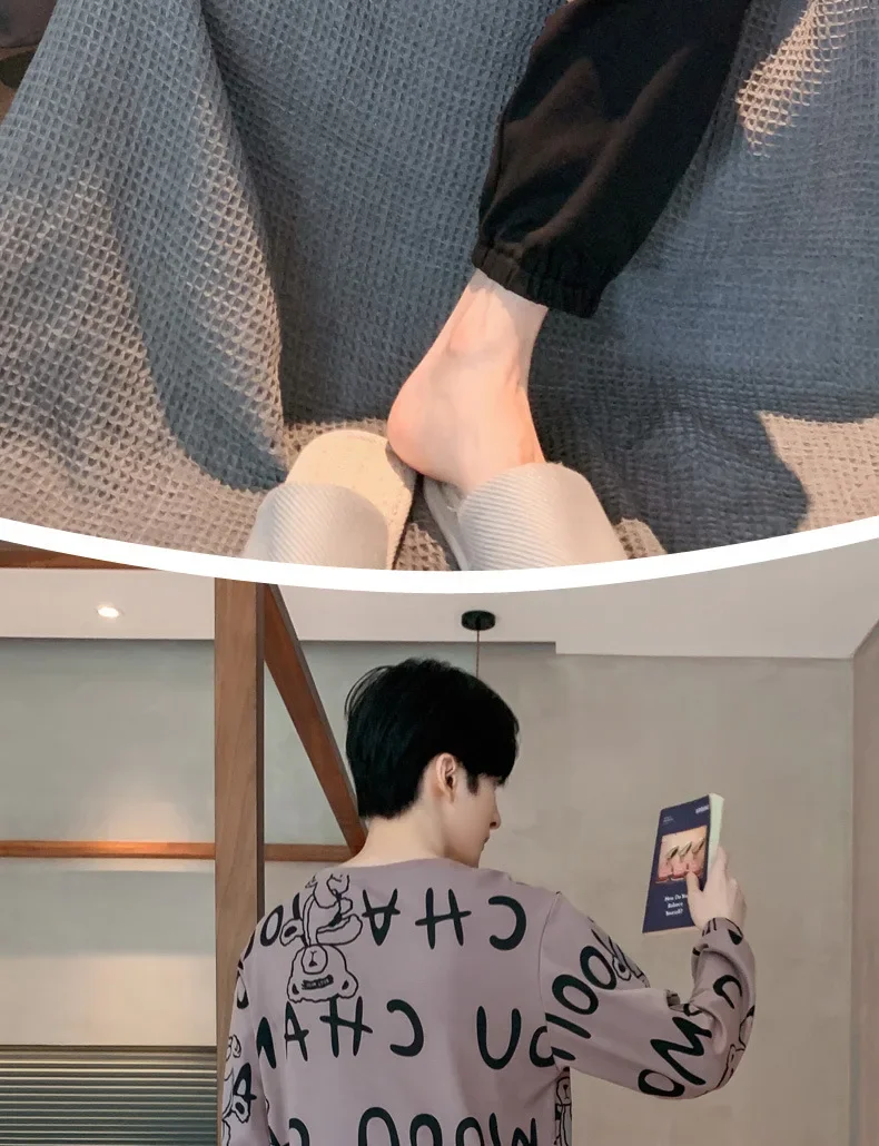 Plus size pijamas masculinos manga longa solto respirável cinza dos desenhos animados urso listras preto o-pescoço macio loungewear conjunto de duas peças