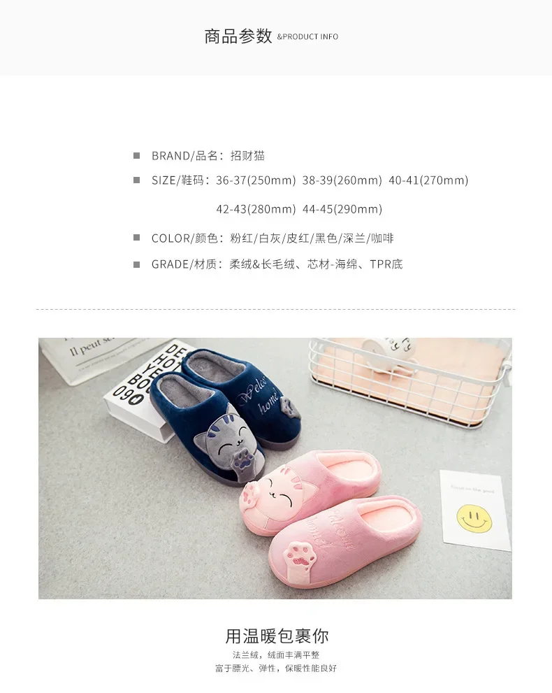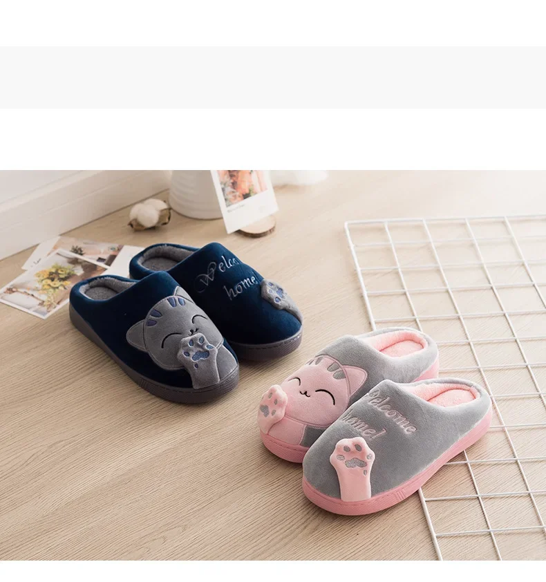Plush Cartoon Cat Slippers para mulheres, sapatos quentes, redondos Toe Flats, interior, casa, quarto, chão, senhoras, peludo, inverno