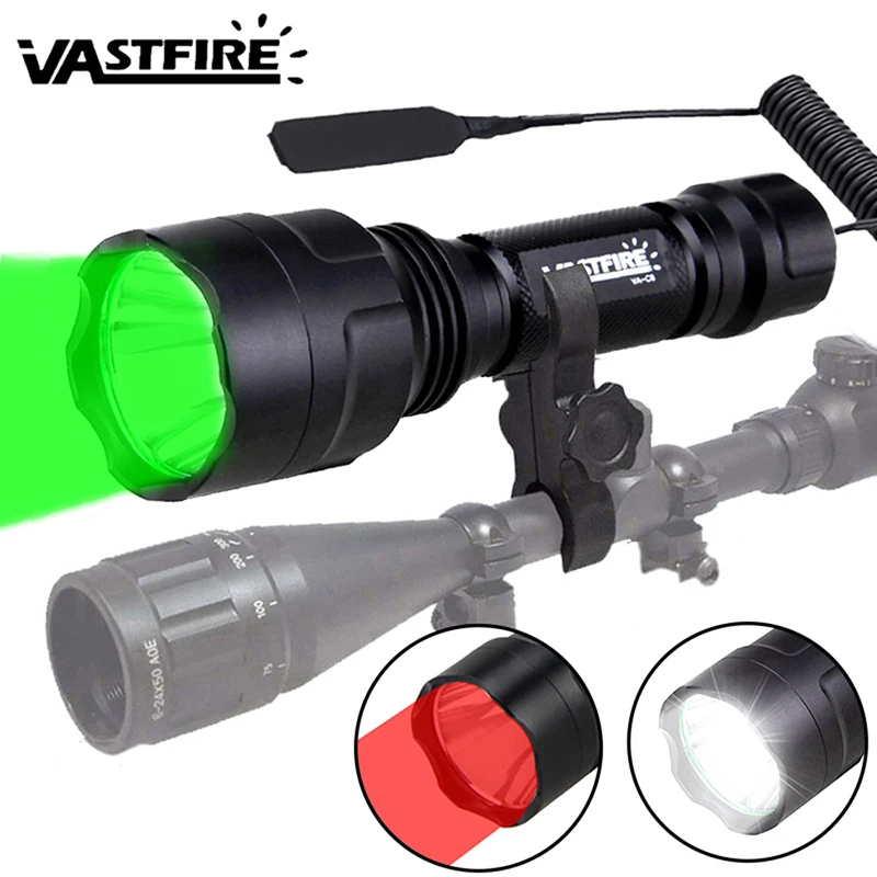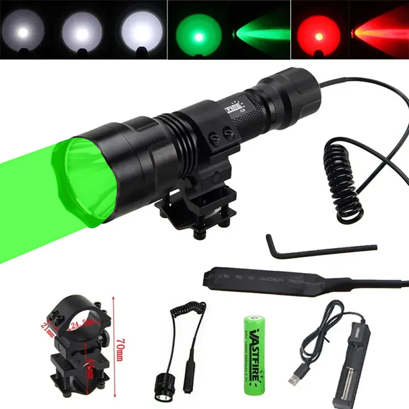 Poderosa lanterna c8 tática verde/vermelho/branco tocha caça 1-mode predador tocha portátil + clipe + interruptor traseiro + 18650 + conjunto de carregador