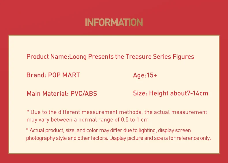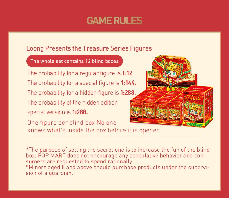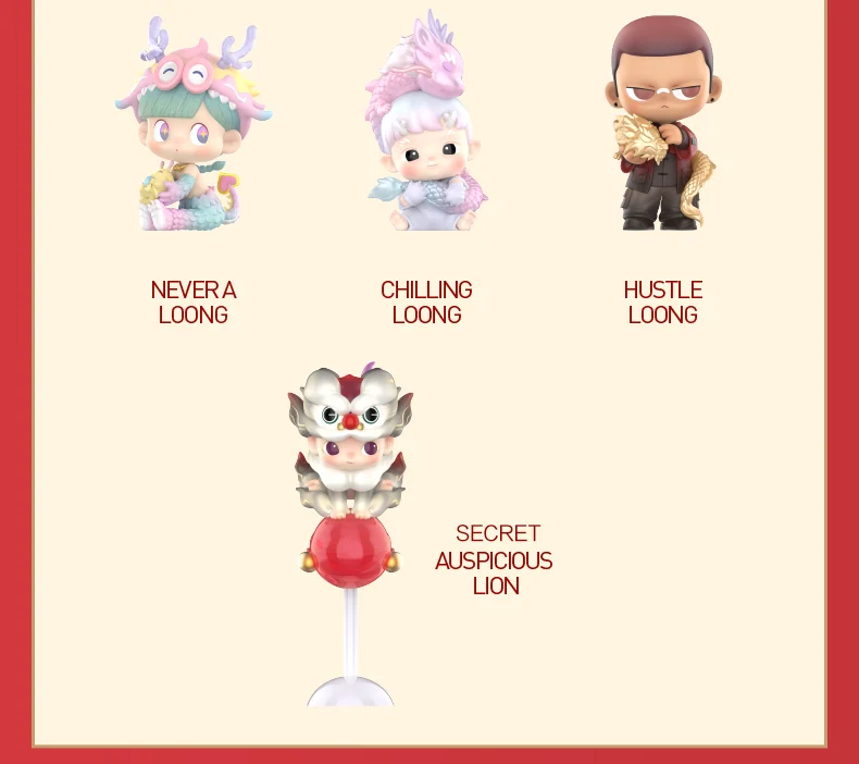 Loong Apresenta a Série Treasure inclui 12 figuras regulares, 12 figuras especiais, 1 figura oculta e 1 edição especial da figura oculta.Todo o conjunto contém 12 caixas cegas.