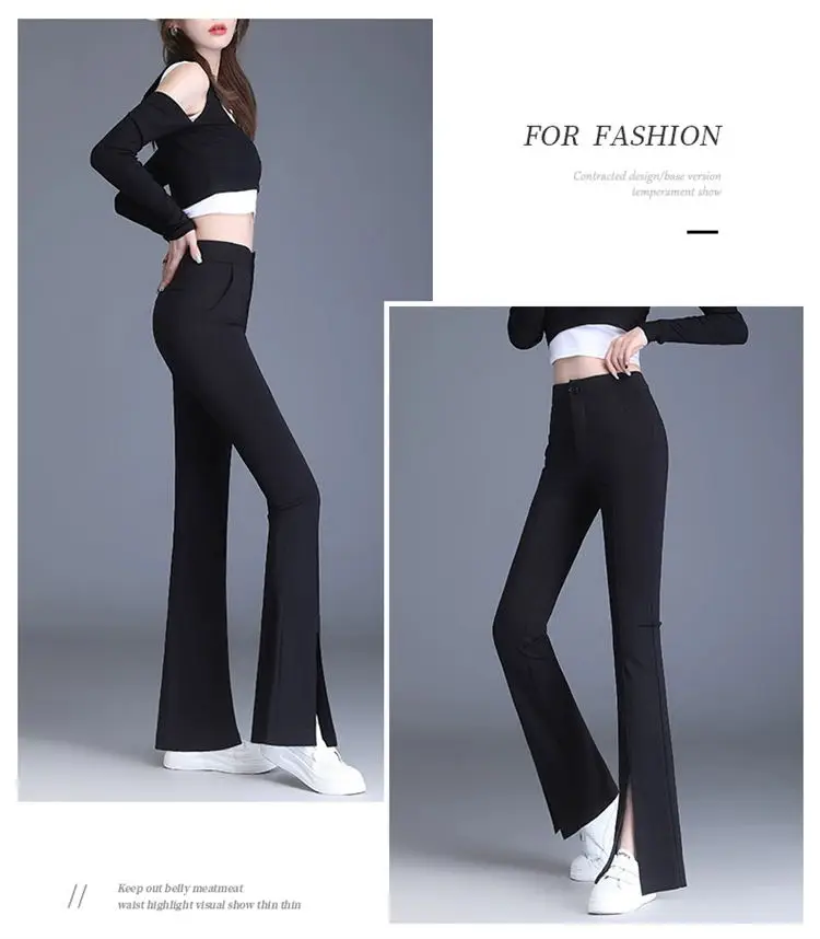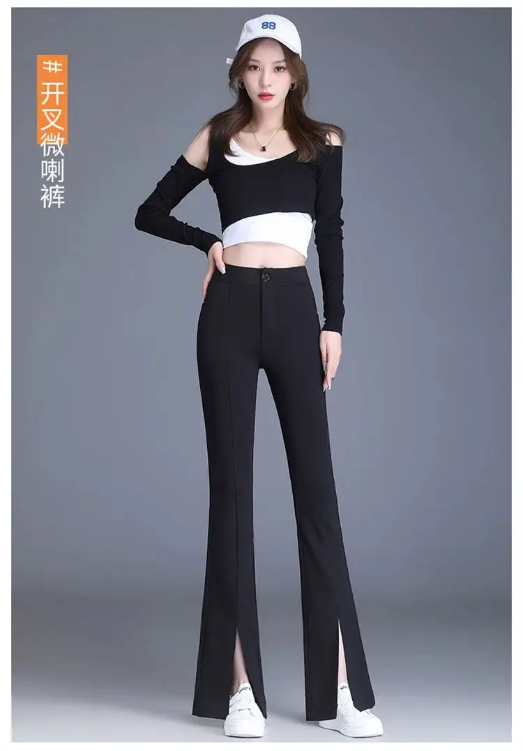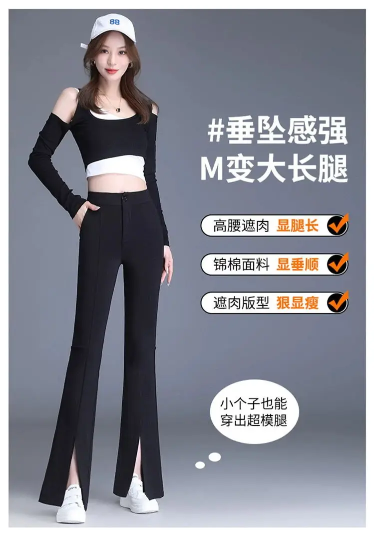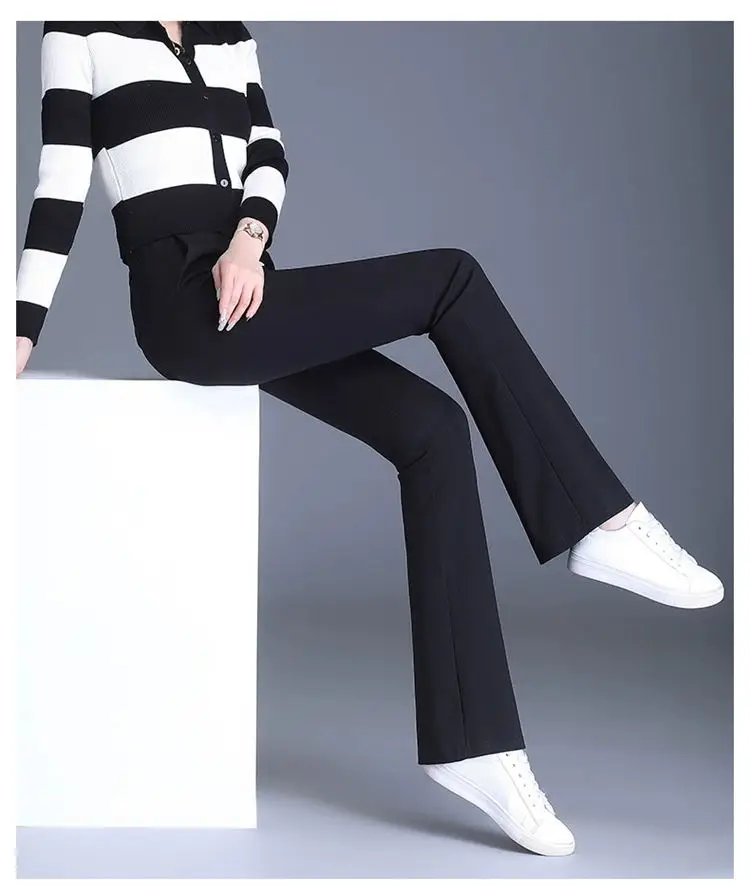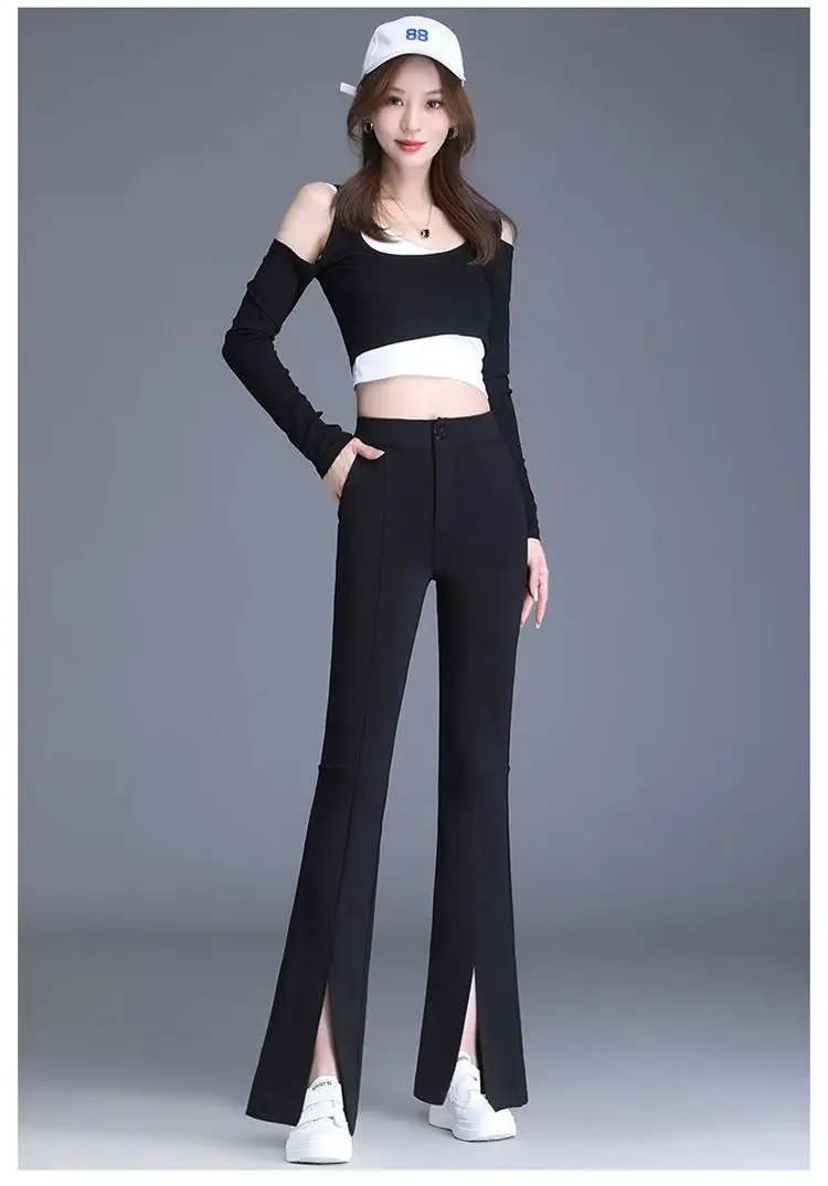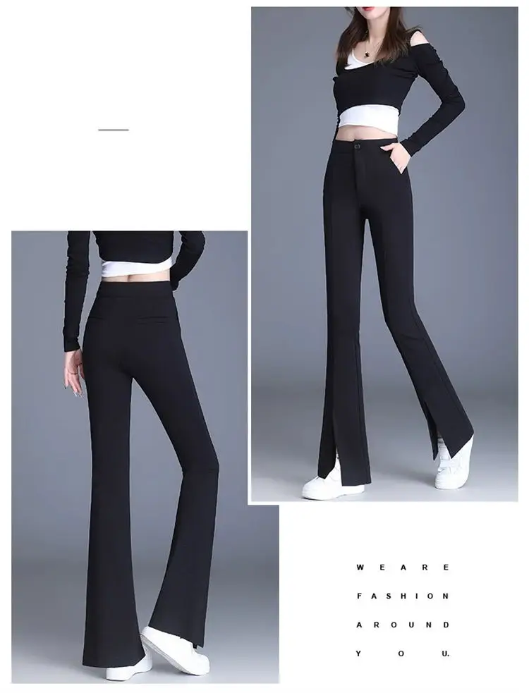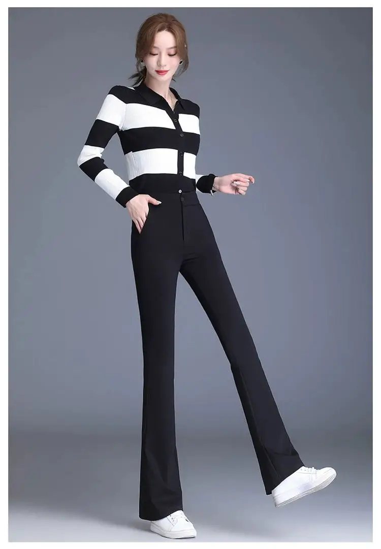 Preto casual fino ajuste sino inferior para mulheres de cintura alta primavera e outono elástico fino ajuste casual pendurado sino calças inferiores
