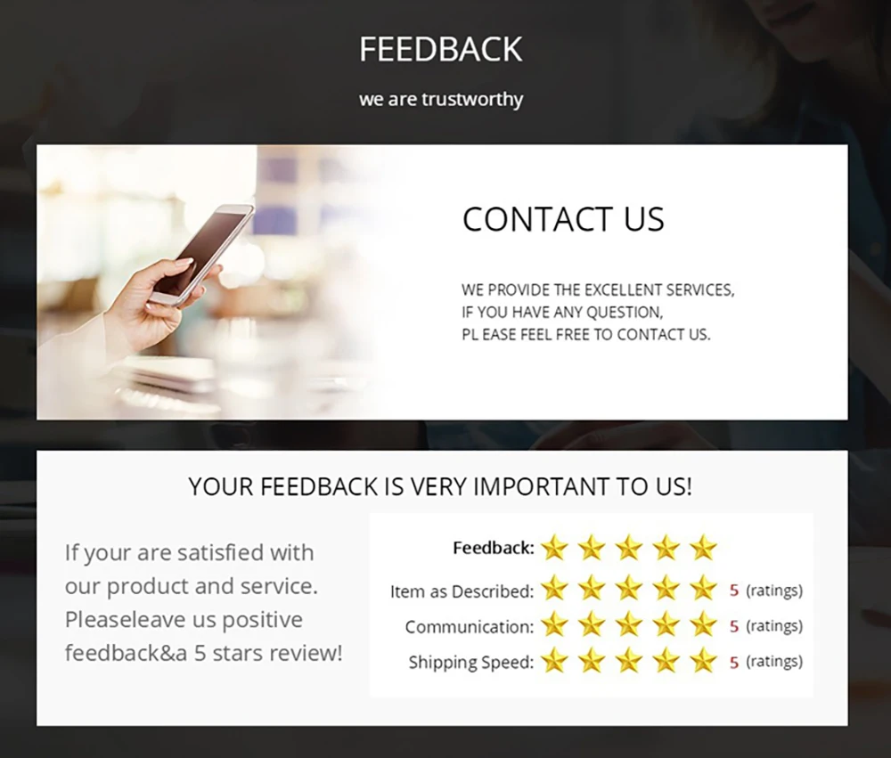 We request that you contact us immediately BEFORE you give us neutral or negative feedback, so that we can satisfactorily solve your concems.