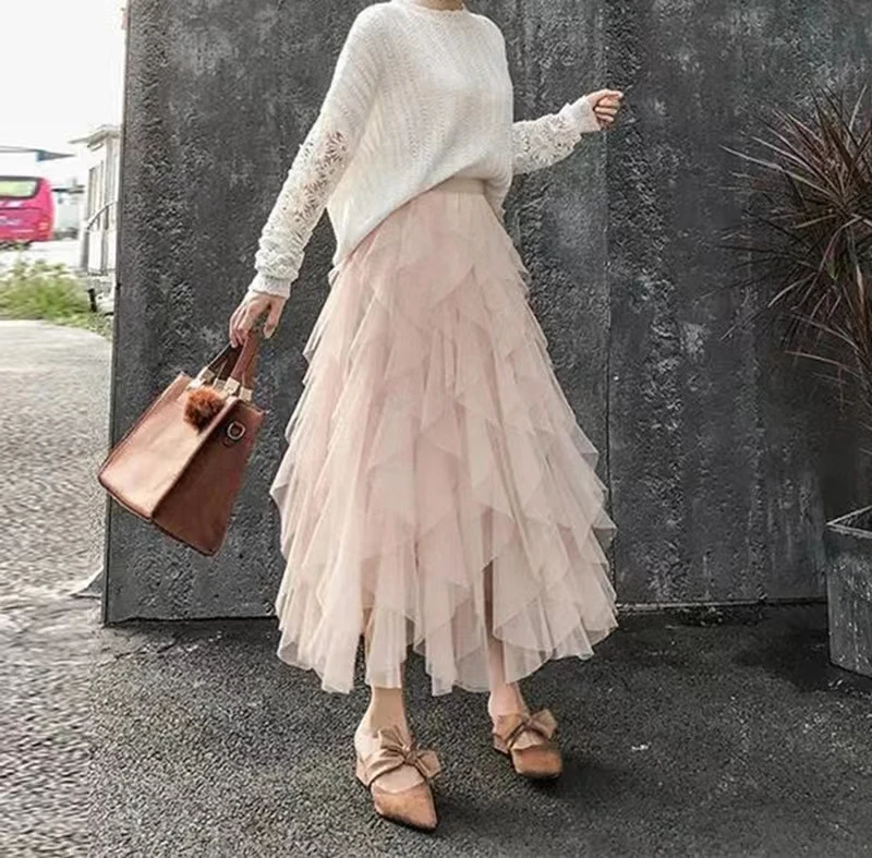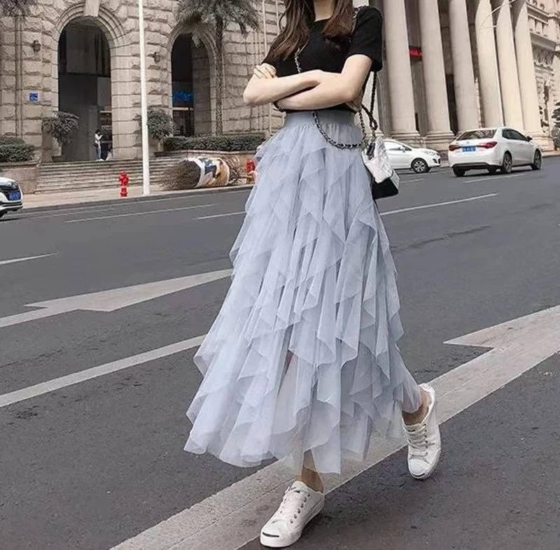 Primavera 2024 versão coreana cintura elástica moda versátil emagrecimento malha emenda irregular comprimento médio saia de cintura alta