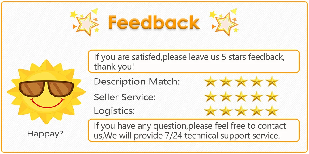 R: Sua recomendação é muito apreciada. Se você estiver satisfeito, deixe-nos um feedback positivo e uma classificação de 5 estrelas. Seu reconhecimento nos deixará mais confiantes para desenvolver nosso negócio e atendê-lo melhor. Se você tiver algum problema com o produto, entre em contato conosco livremente para resolvê-lo. Forneceremos serviço de suporte técnico 24 horas por dia, 7 dias por semana.