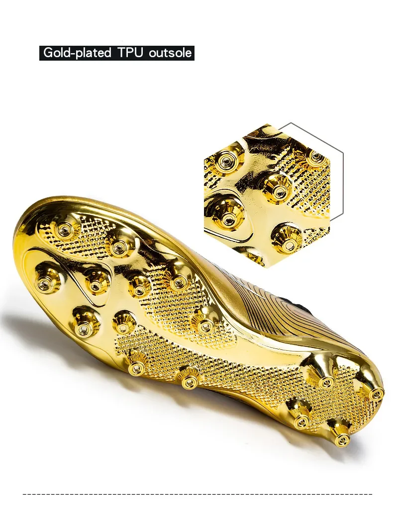 Ponto de venda 4: Sola de TPU banhada a ouro; pontas redondas facilitam que os atletas mudem de direção.