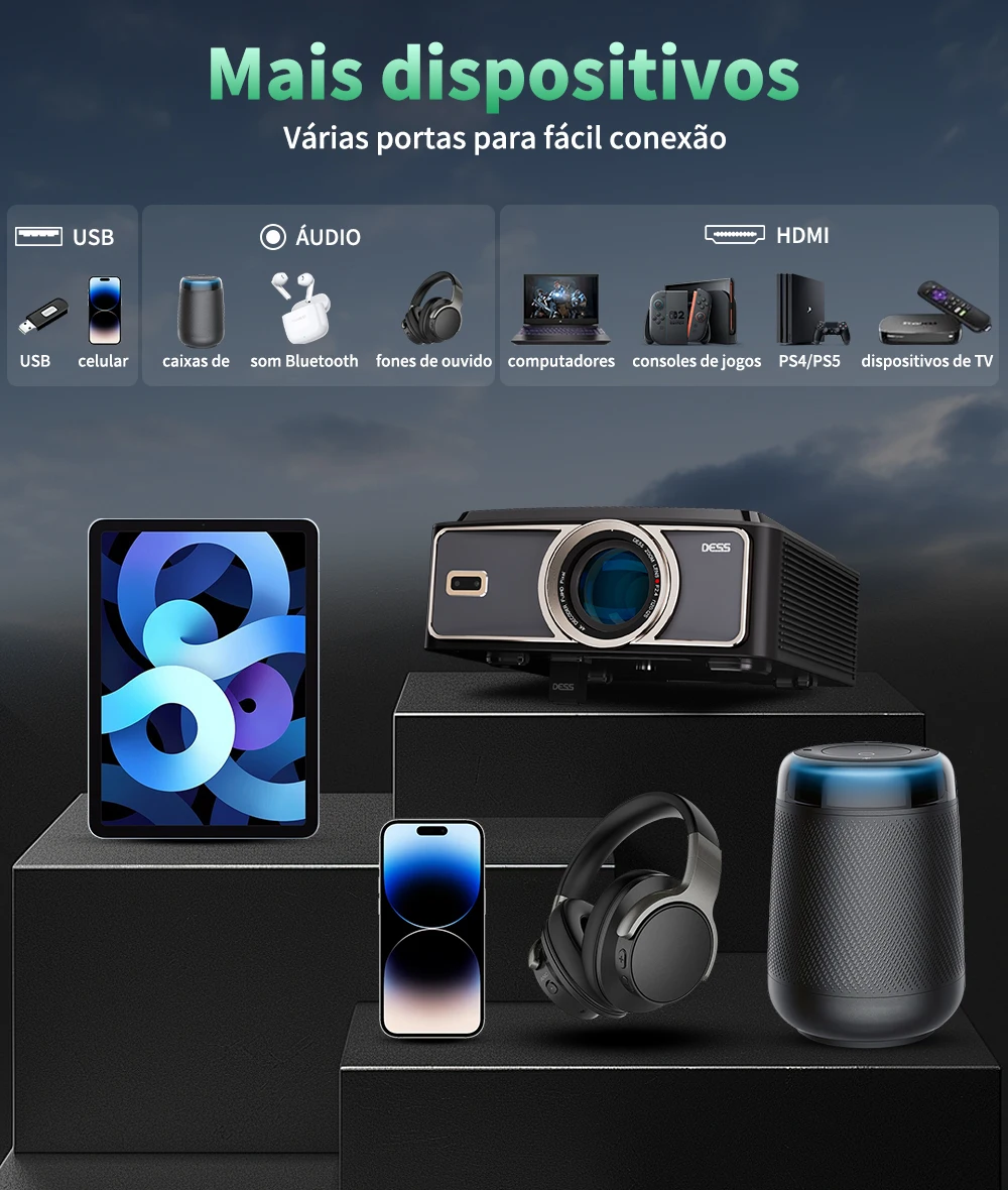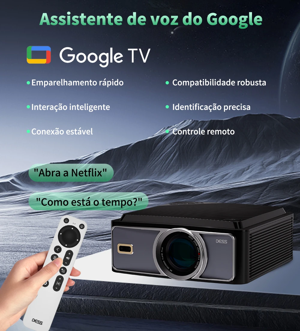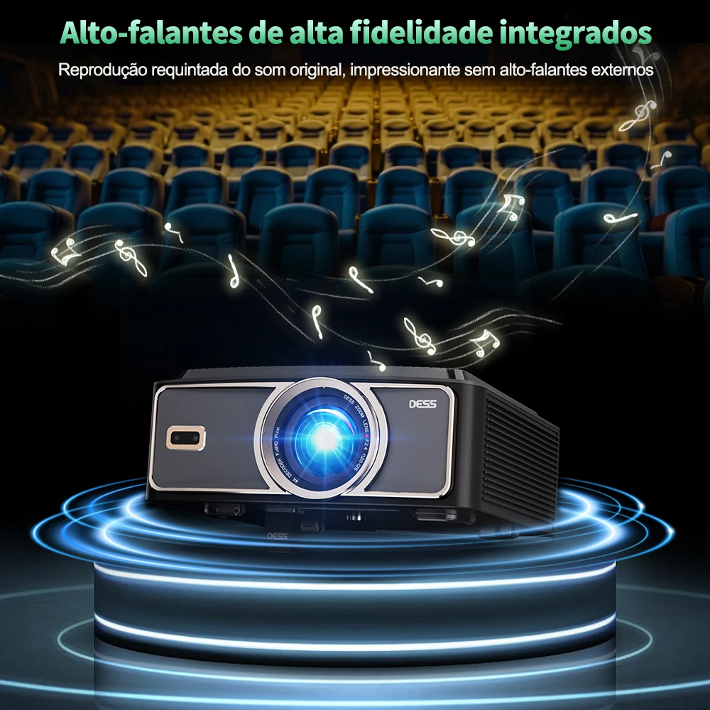 - > Projetor DESS 4K com foco automático, banda dupla, WiFi 6 BT5.2, projetor portátil para escritório e casa, Android Cinema Smart