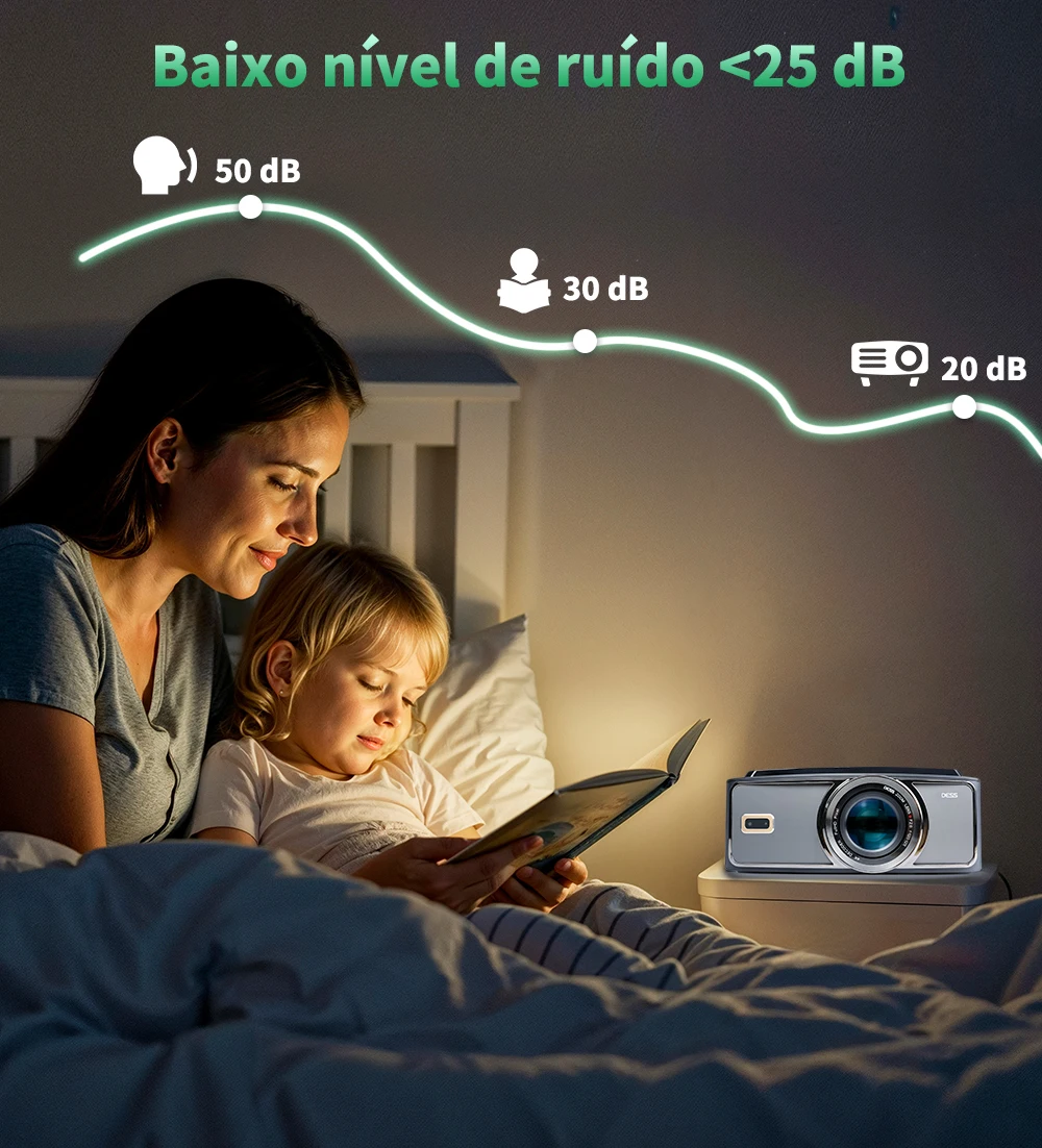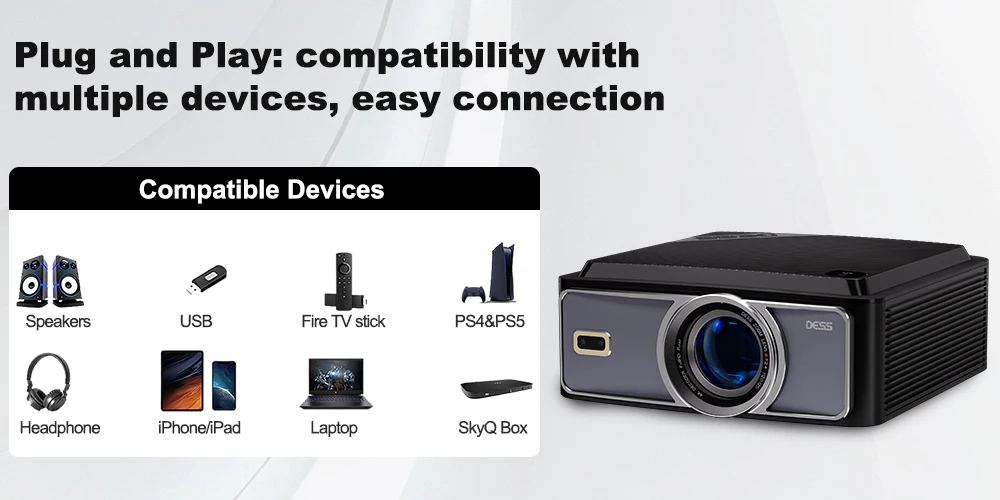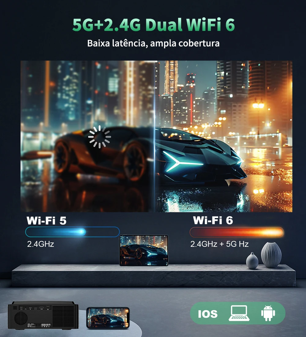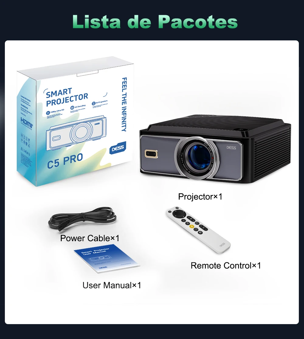 - > Projetor DESS 4K com foco automático, banda dupla, WiFi 6 BT5.2, projetor portátil para escritório e casa, Android Cinema Smart