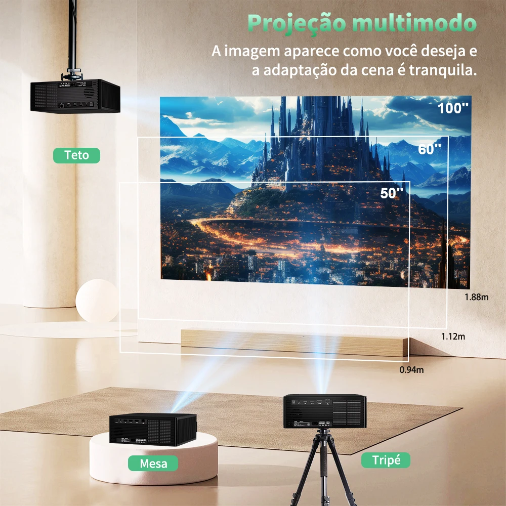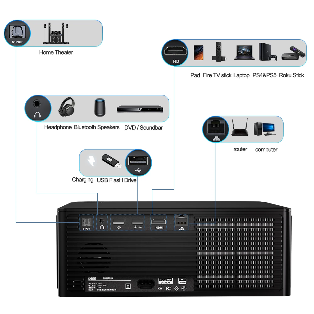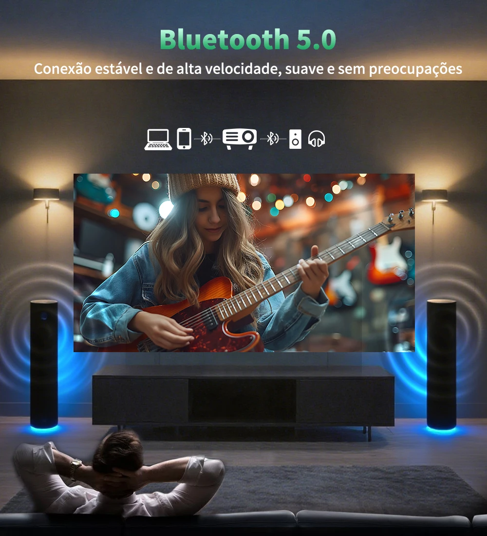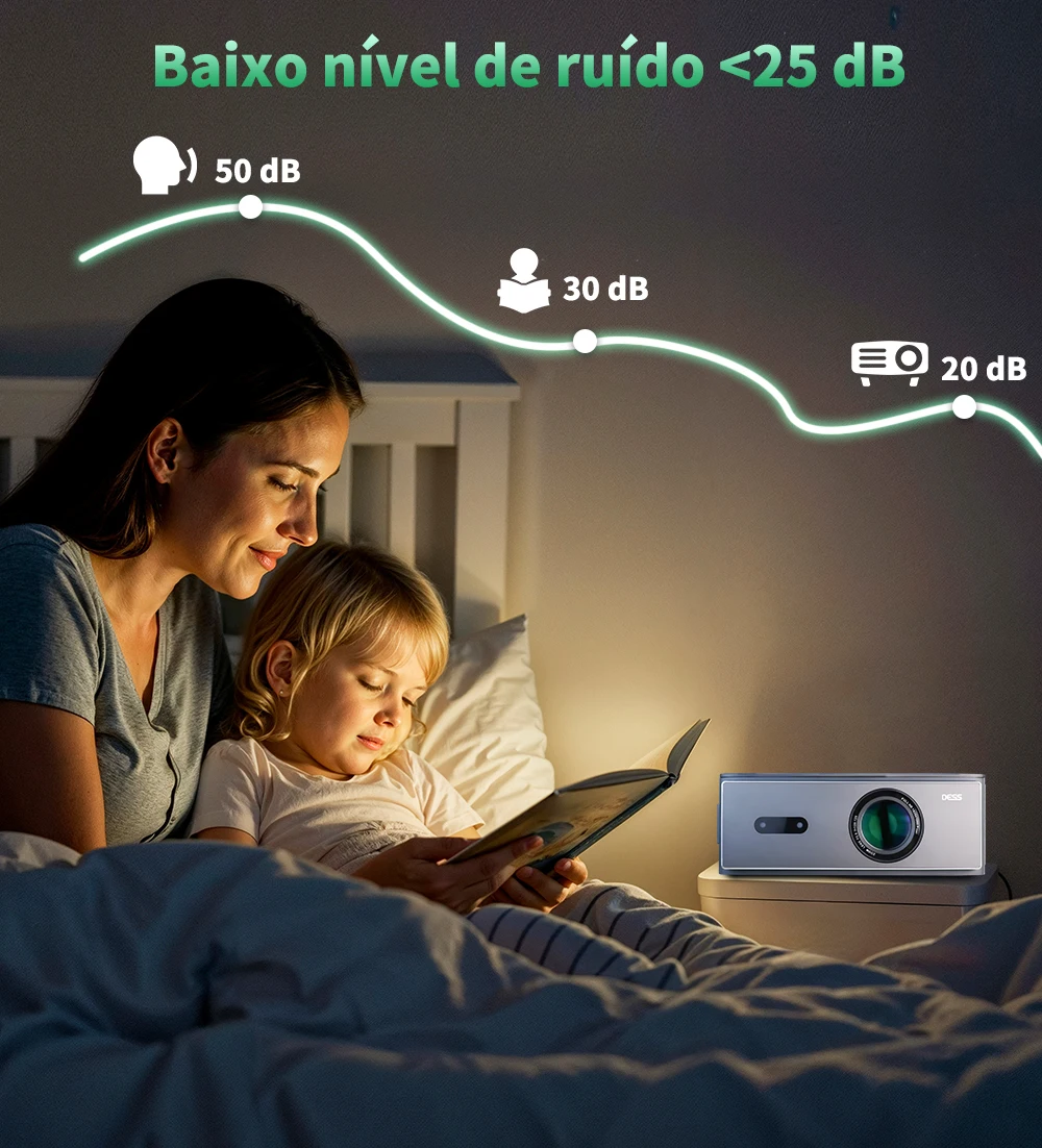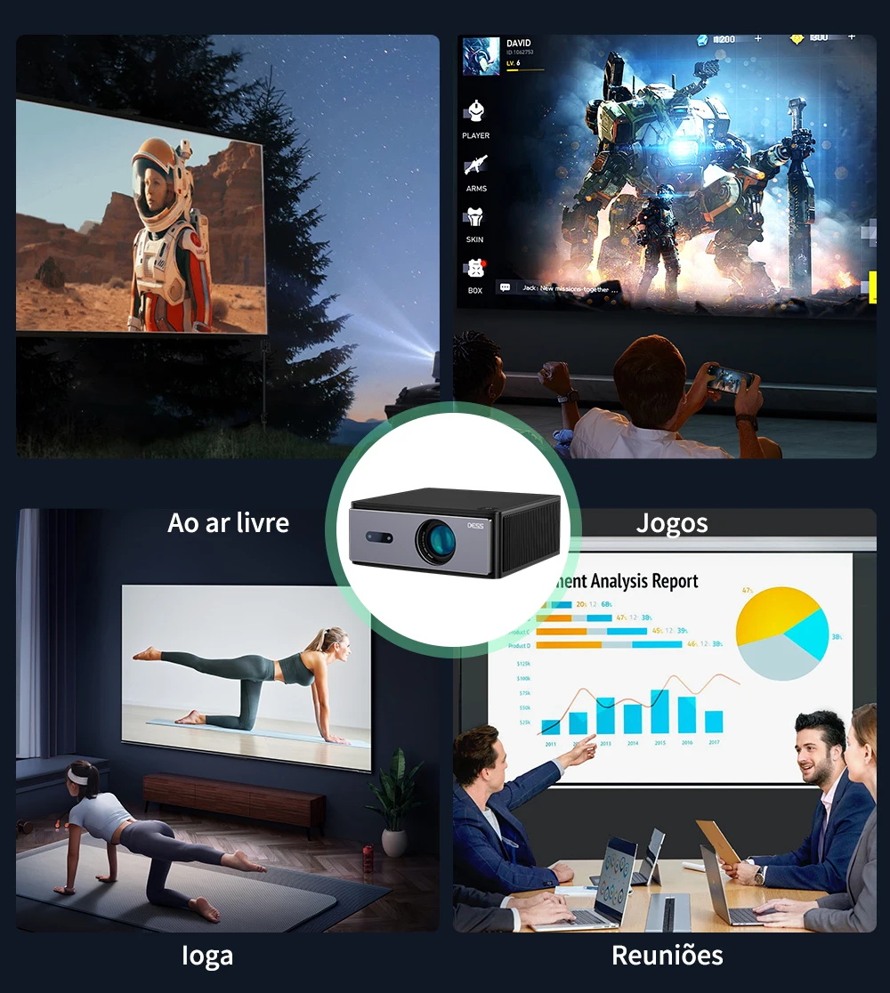 Nosso projetor DESS é centrado no usuário e oferece uma variedade de recursos para aprimorar sua experiência de visualização. A tela do projetor possui um projetor Android 4k e original 1080p. Sua qualidade de imagem é super alta definição e portátil, para que você possa desfrutar da atmosfera de uma tela ultra-grande de alta definição com nível de filme em casa.