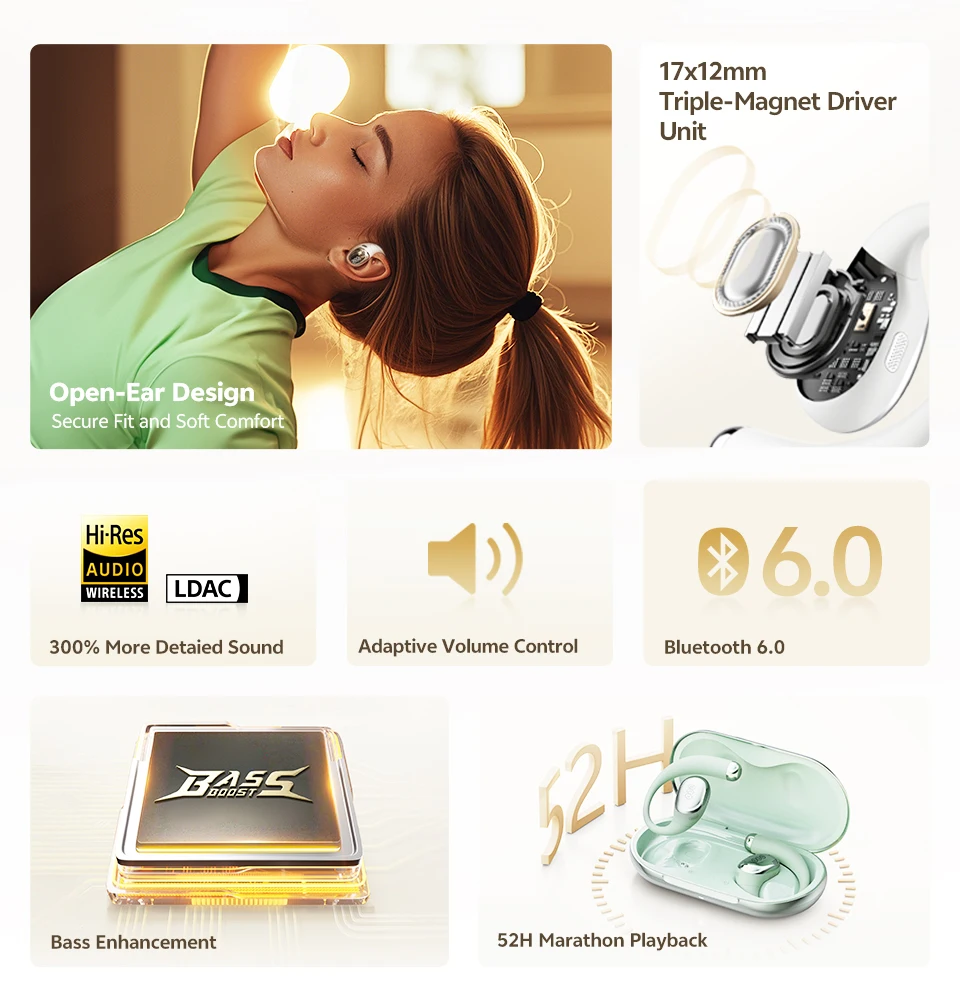 A unidade de driver de tripla imã de 17x12mm estabeleceu um novo padrão de referência para a qualidade de som em fones de ouvido abertos, oferecendo graves potentes e detalhes cristalinos.